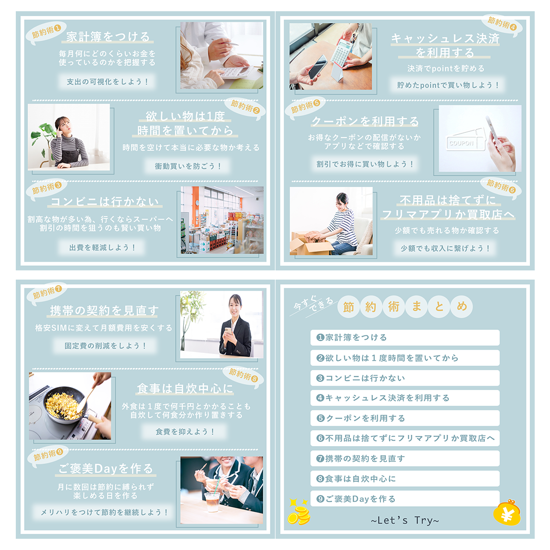 ◇3枚目まではデザインを統一、4枚目で一覧にして読みやすくしました。