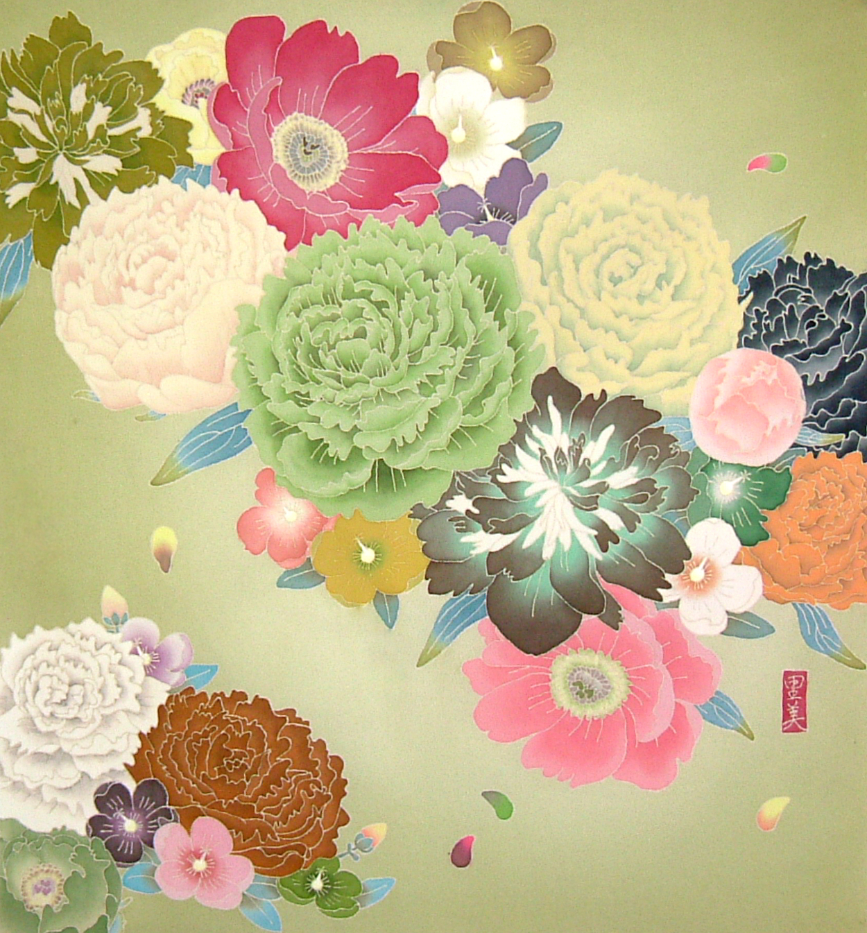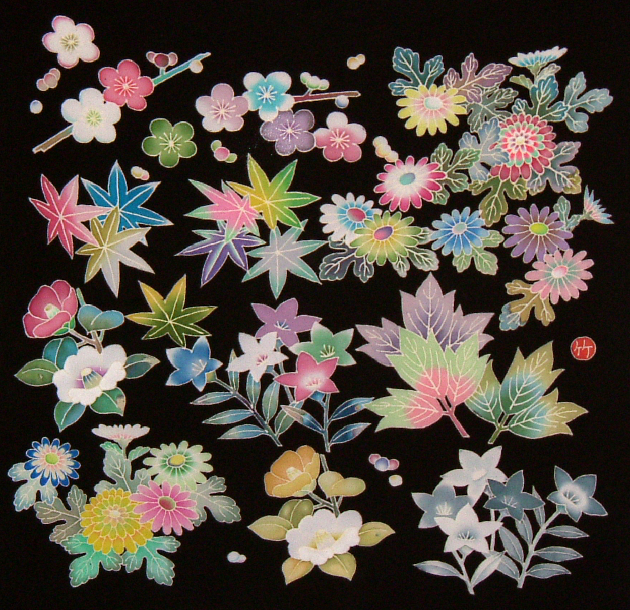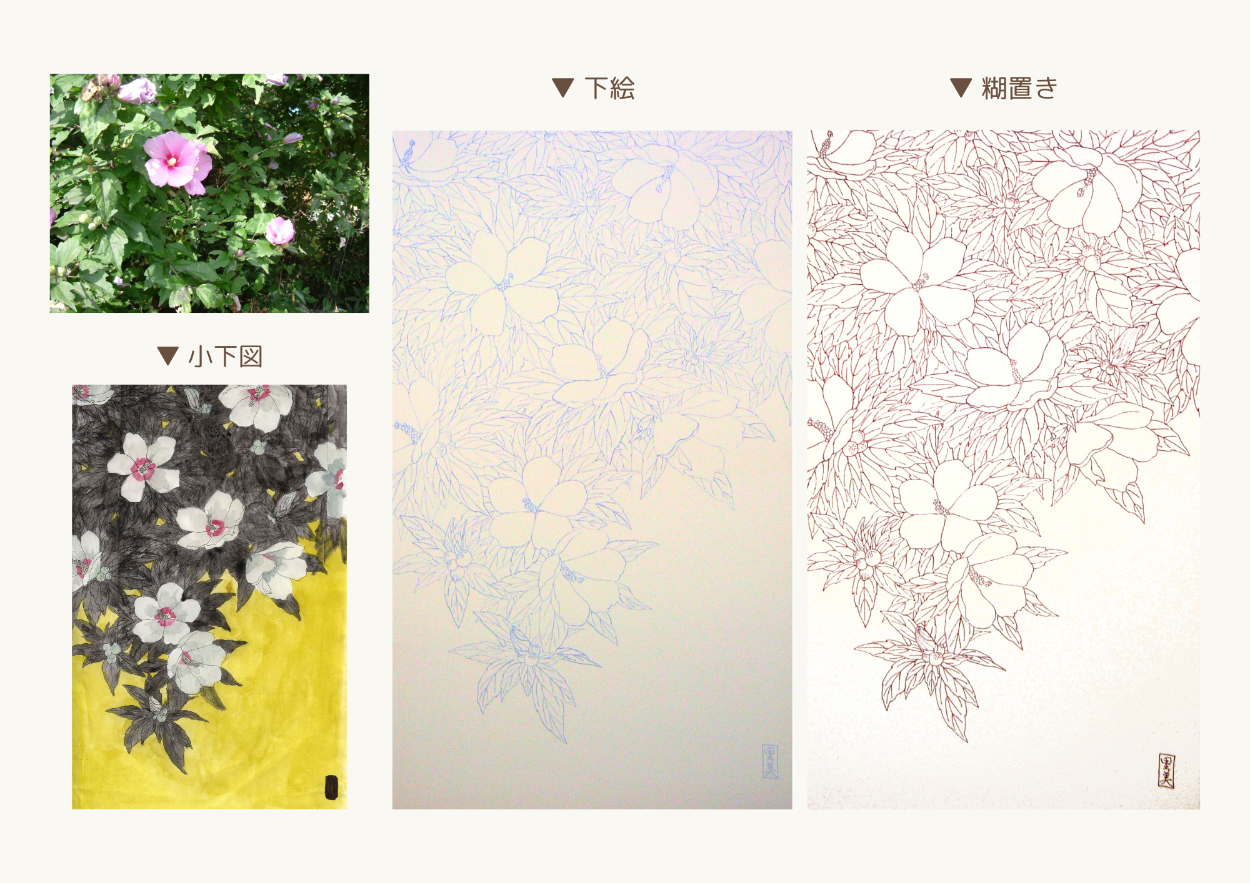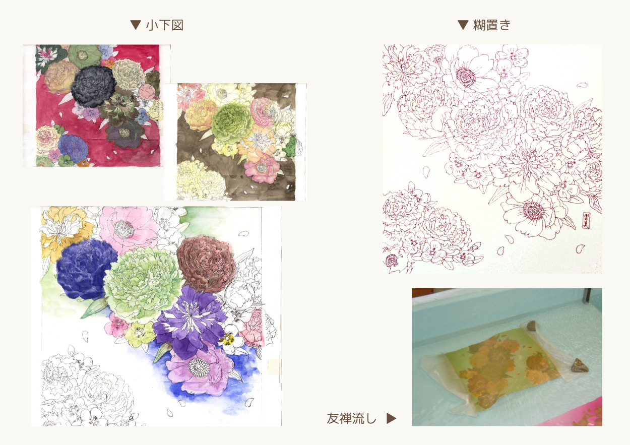 💡学習内容 図案作成 ➢下絵 ➢ 糊置き ➢ 彩色 ➢ 地染 ➢ 水洗