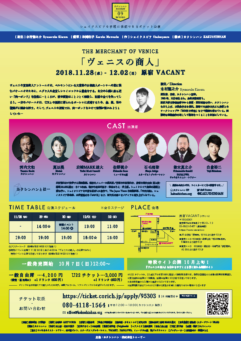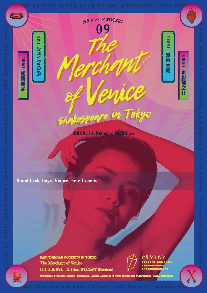 ヴェニスの商人 Iori Nakamura デザイナー OVERVIEW カクシンハン公演:ヴェニスの商人:広告物制作 シェイクスピアを現代の日本仕様に置き換えた、非常にエッジの効いた演劇の内容にマッチする様なグラフィックを制作しました。 YEAR 2018 01. フライヤー02. チケット WEBSITE