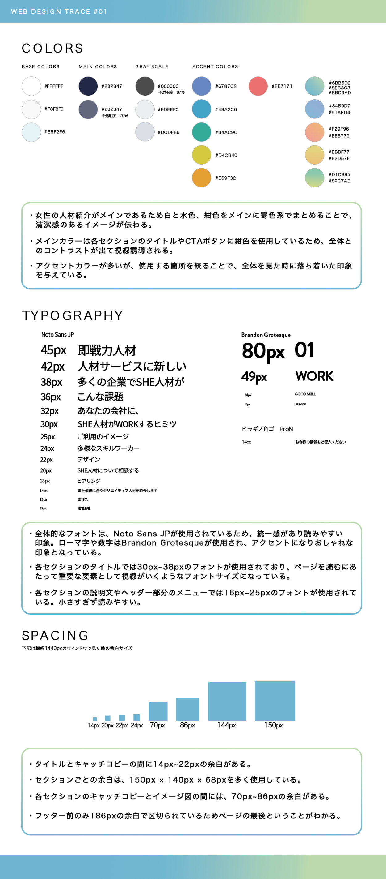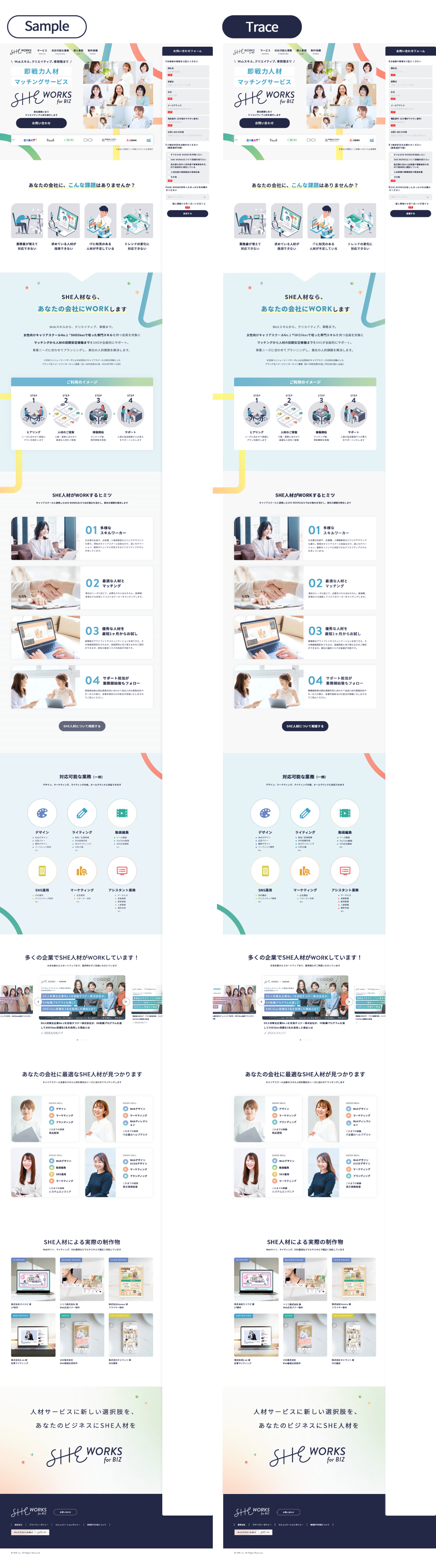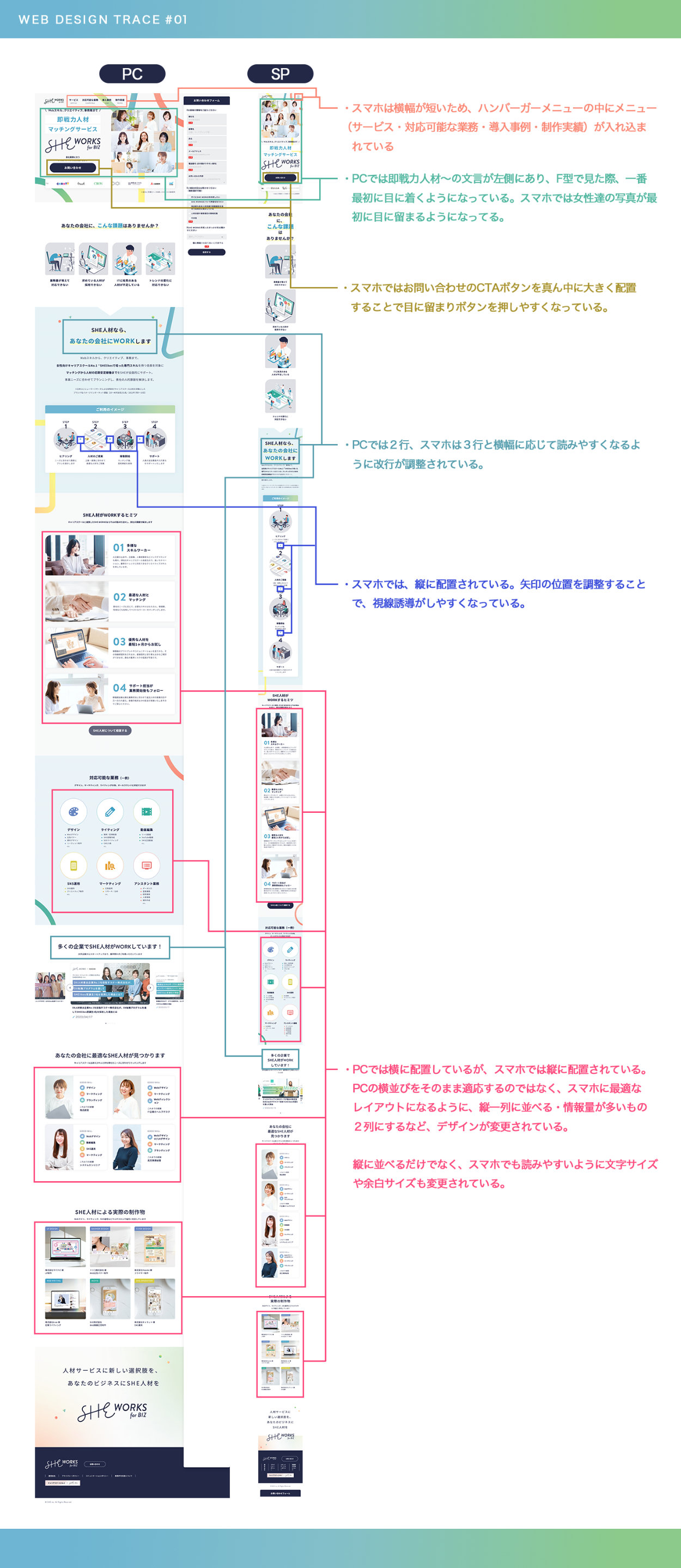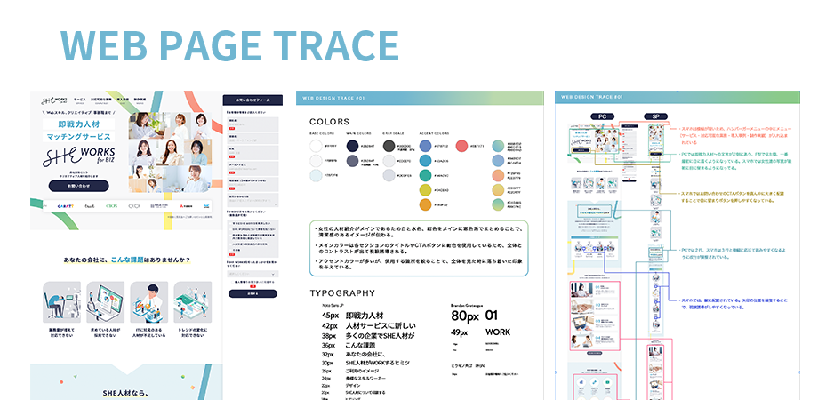 ◾️SHElikes MULTI CREATOR COURSEの課題◾️SHE WORKSのWebページをPhotoshopでトレース◾️スタイルガイドを作成◾️PCとSPでのレイアウトの違い分析資料作成◾️使用ツール:Photoshop-2025.05