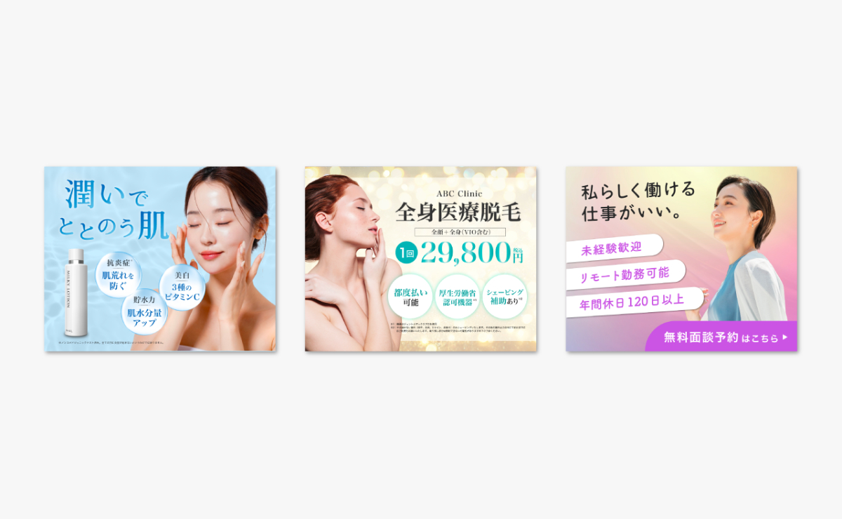 左の化粧水のバナーではみずみずしさや潤いを表現するため、適切なフォントや文字色を選びました。中央の美容医療バナーでは、ターゲットを富裕層と仮定しゴールドの背景やラメ、フォントで高級感を演出しています。右の求人バナーでは「私らしく働きたい」と上を向くイメージに合うよう、要素の角度を右斜めにしたり明るめの色合いを採用しました。ターゲット層や伝えたいメッセージから適切なデザインを考えます。