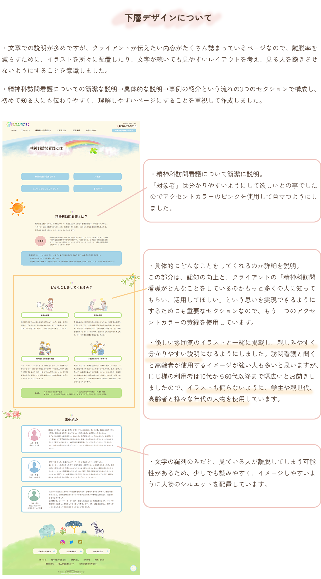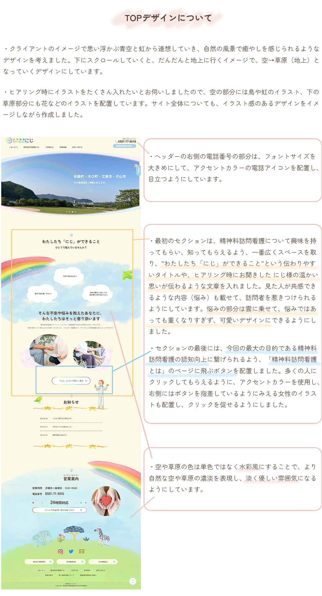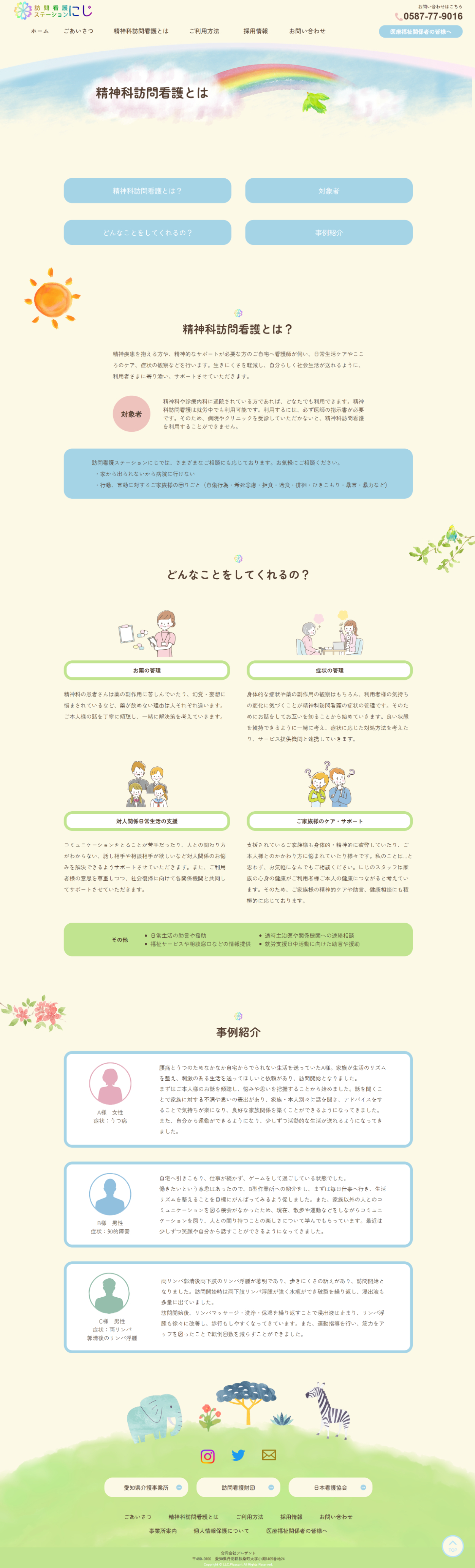 訪問看護ステーションにじ様のWebサイトをチームで制作しました。 ヒアリングから情報設計、ワイヤーフレーム、デザイン、コーディングまで行いました。