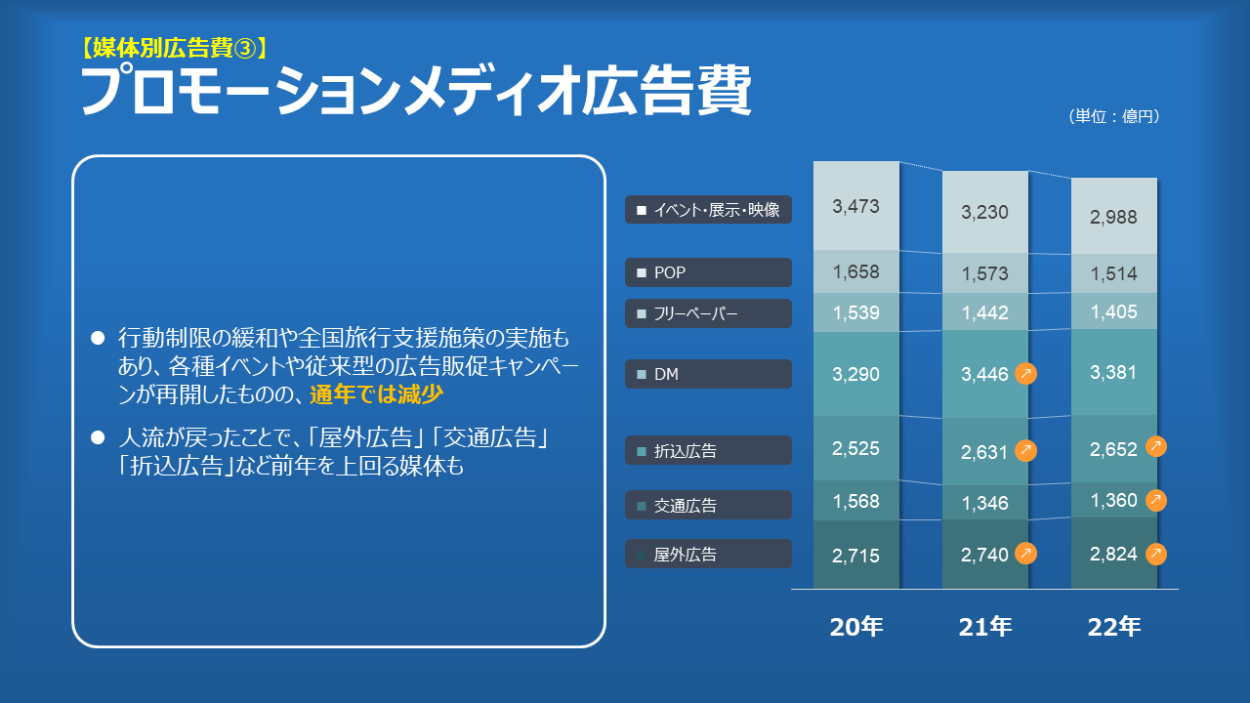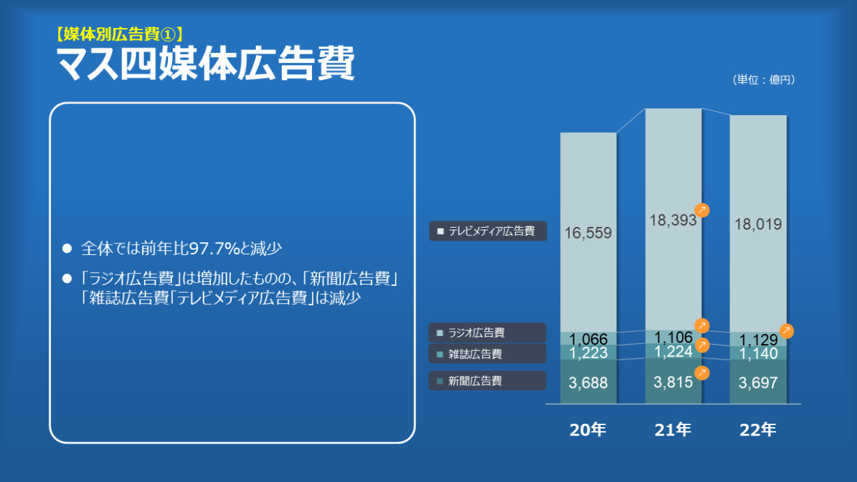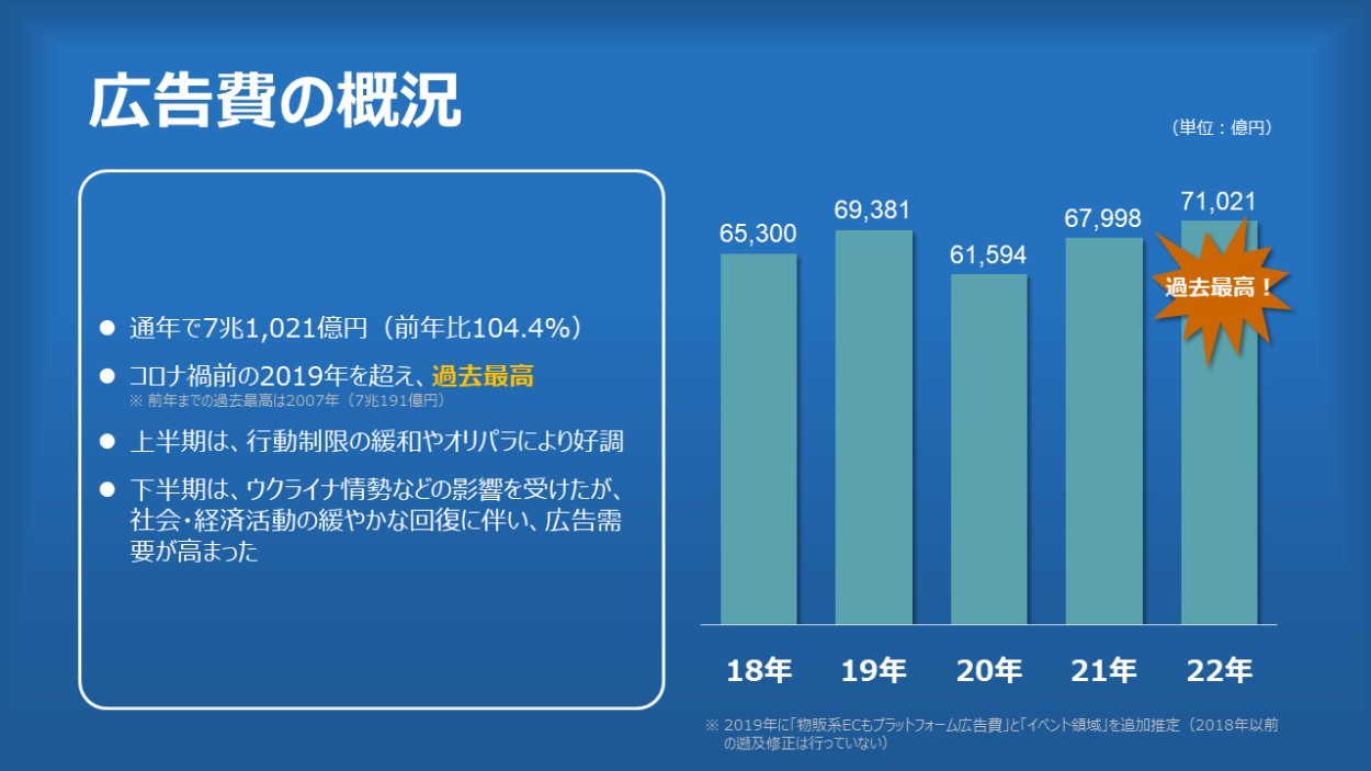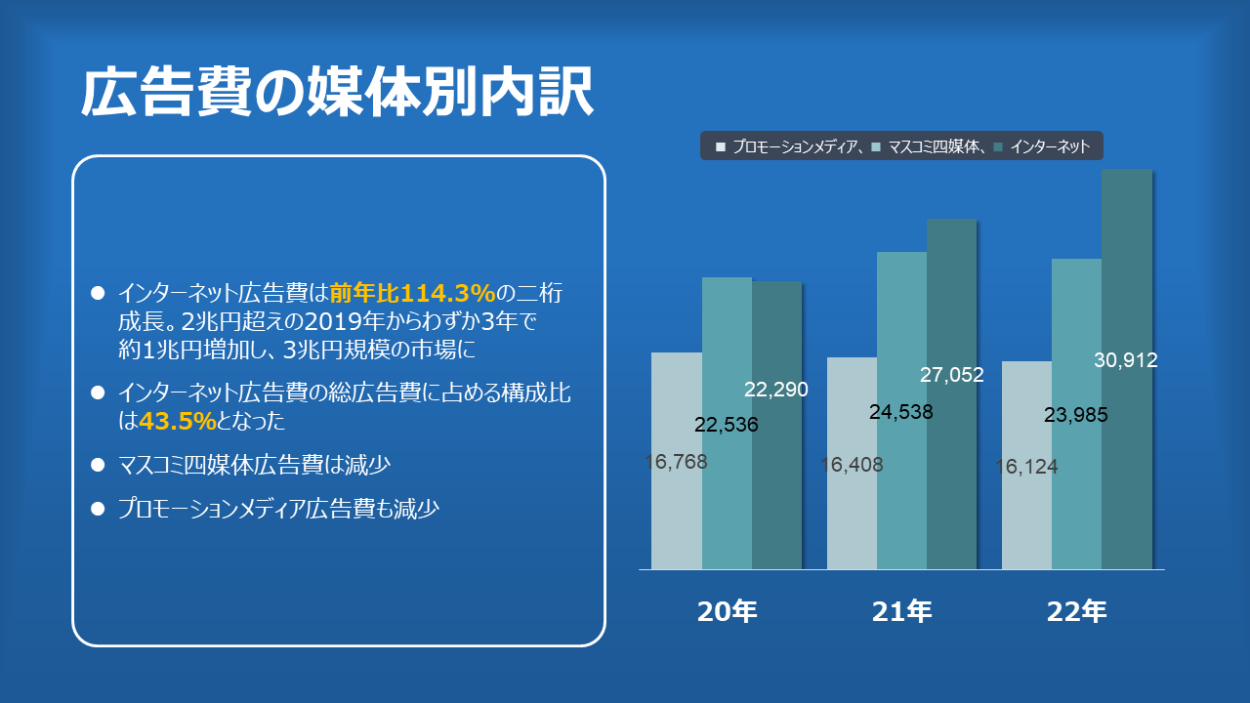日本の広告費2022 moaii パワポデザイナー OVERVIEW 電通が毎年発表している「日本の広告費」の要点をパワーポイントでビジュアライズしてみました。 YEAR 2023 元のページはこちら。そしてパワーポイント化したファイルはこちら WEBSITE