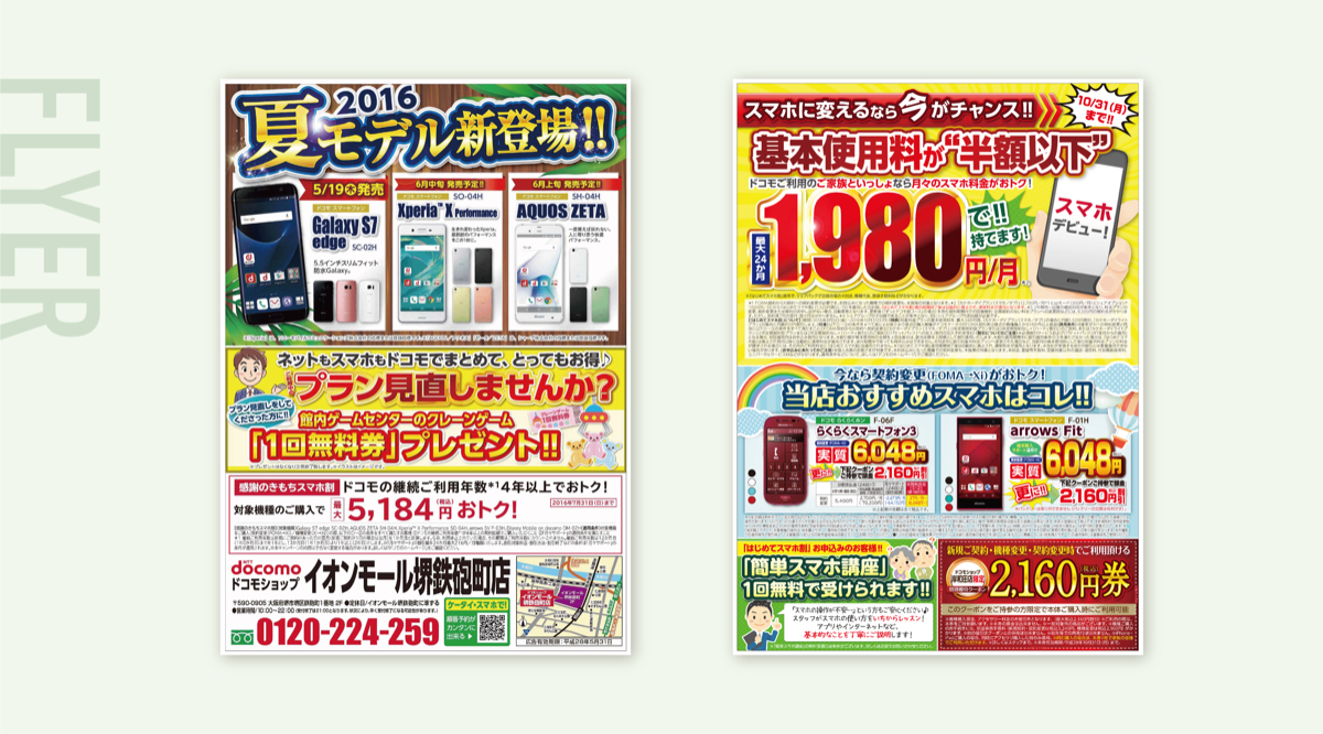 【折込チラシ】携帯ショップ 渡利 亜有子 グラフィックデザイナー OVERVIEW 夏モデル発売告知チラシ YEAR 2016 ●ツール / B4サイズ 折込チラシ(両面印刷)● 内容 / 夏モデル発売告知チラシお客様が楽しんでもらえる特典やクーポンは内容お打ち合わせの際にご提案させていただきました。