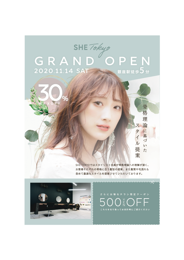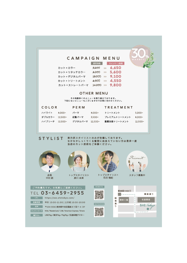 SHElikes MULTI CREATOR COURSEの課題制作で、新しくオープンした美容室の来店促進を図るフライヤーのデザインをしました。 制作時間:8時間 制作時期:2021年8月