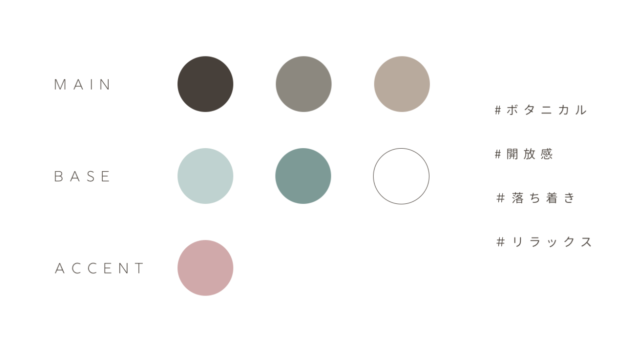落ち着いておしゃれな印象がありつつも、開放的な空気感や、ボタニカルな印象を持ってもらいたいと思い、ベースカラーを淡いブルーグリーン、メインカラーをブラウン、アクセントカラーにくすんだピンクを選定しました。