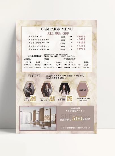 - 背景の大理石模様はPhotoshopで作成、店舗イメージに応じて色味やテクスチャーを調整しながらトンマナに合った背景やフレームのあしらいを設定しました