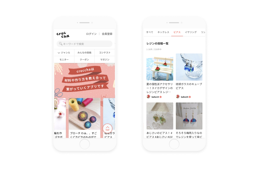 トップページではcrocchaがどのようなサービスなのか説明するとともに、ユーザーの投稿を表示することでハンドメイドのSNSというコンセプトを押し出しました。