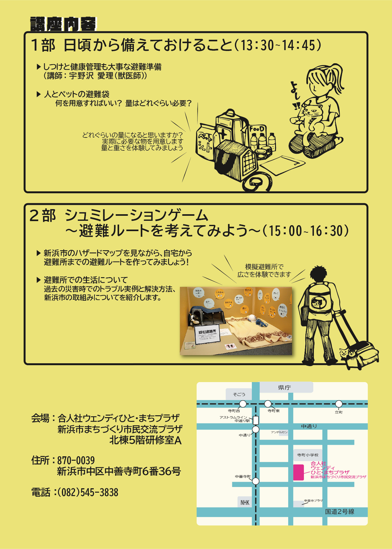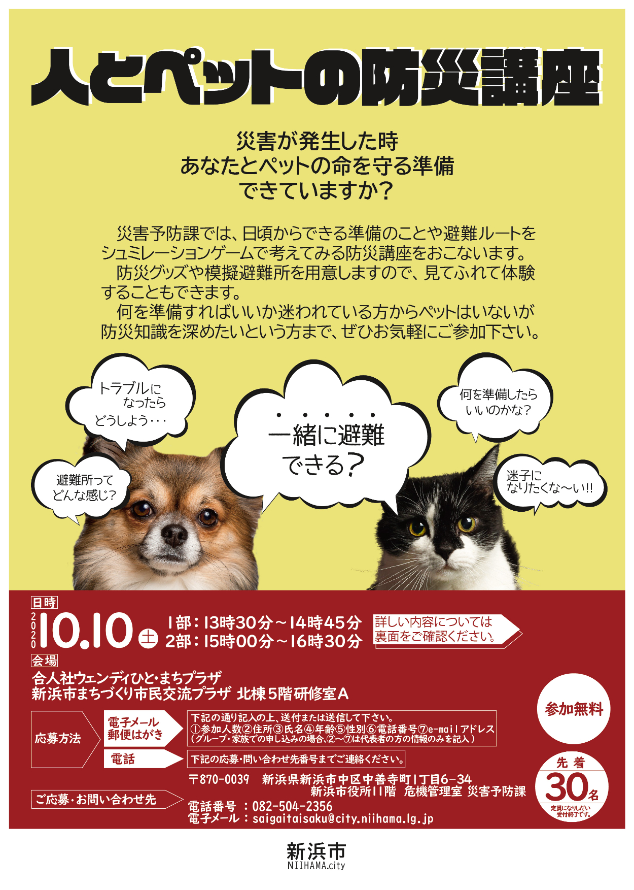 ・仮想の市町村「新浜市」の災害予防課がペットを飼育している市民向けに講座を企画した という設定で制作 ・使用ソフト:illustrator/Photoshop ・使用サイト:pixabay