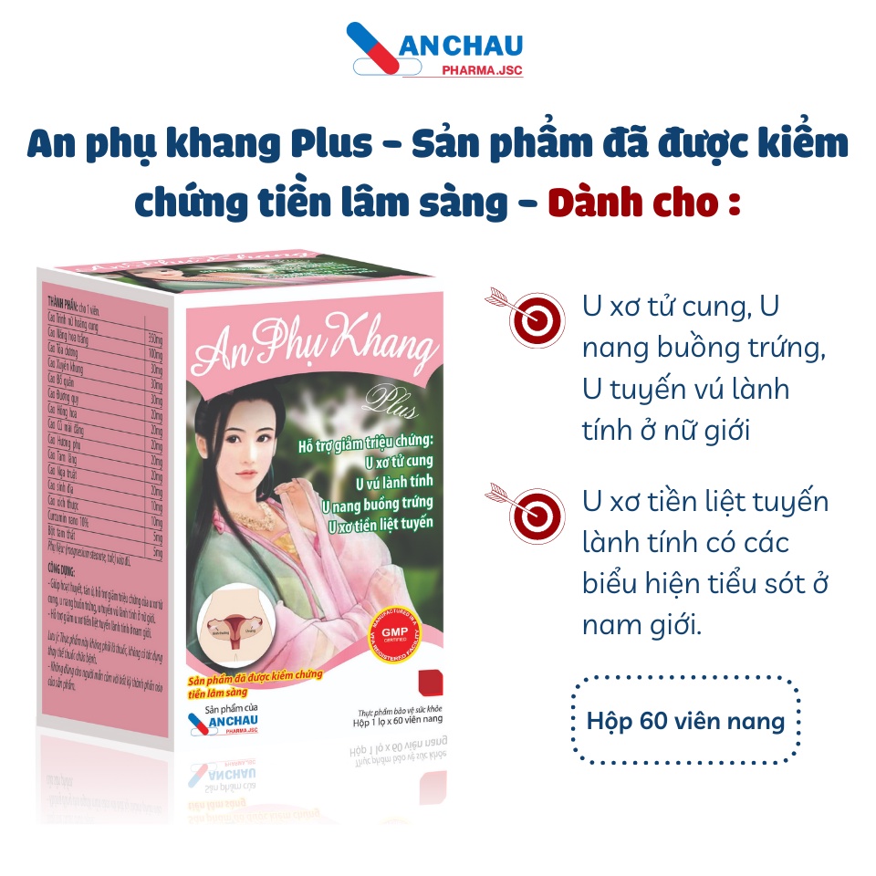 An Phụ Khang là sản phẩm đầu tiên trên thị trường ứng dụng chiết xuất củ mài đắng kết hợp với các thảo dược thuốc nam vào hỗ trợ điều trị các khối u lành tính ở nữ giới. Đặc biệt, sản phẩm đã được nghiên cứu khoa học chứng minh về tác dụng và độ an toàn khi sử dụng, kết quả nghiên cứu được các chuyên gia đánh giá cao.