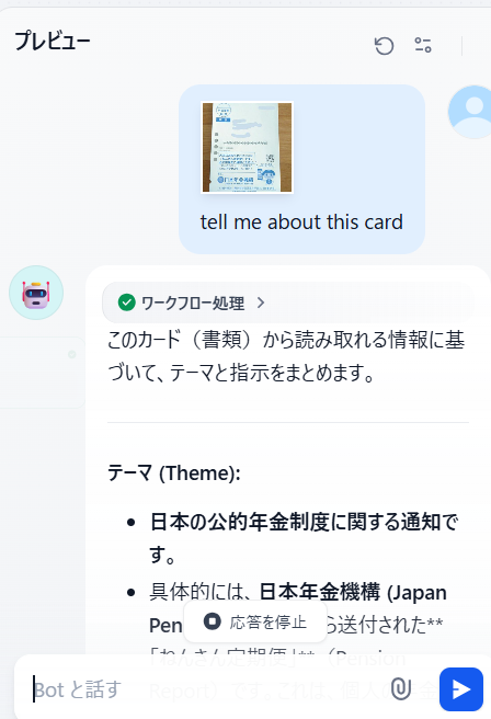 AI からWEBアプリ作ることをしました。その中は日本にいる外国人の方に向けてハガキ(手続きもんだい)問題を解決するために作りました。このAI では、家に届いたわからないハガキをあります。そのハガキについて詳しく指示してくれるWEBアプリです。