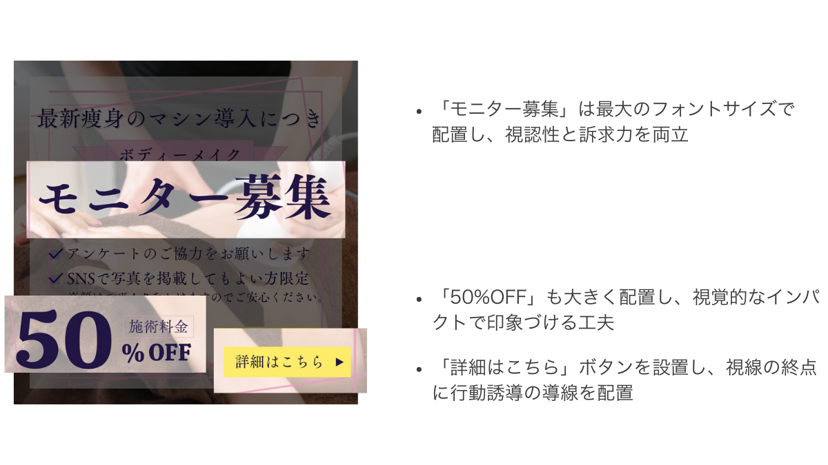 痩身エステチェーンでのSNSキャンペーンを想定した、架空案件のInstagram用バナーデザインです。 30〜50代女性をターゲットに、最新マシン導入に伴うモニター募集の告知を、 信頼感と視認性を重視したシンプルな構成でデザインしました。