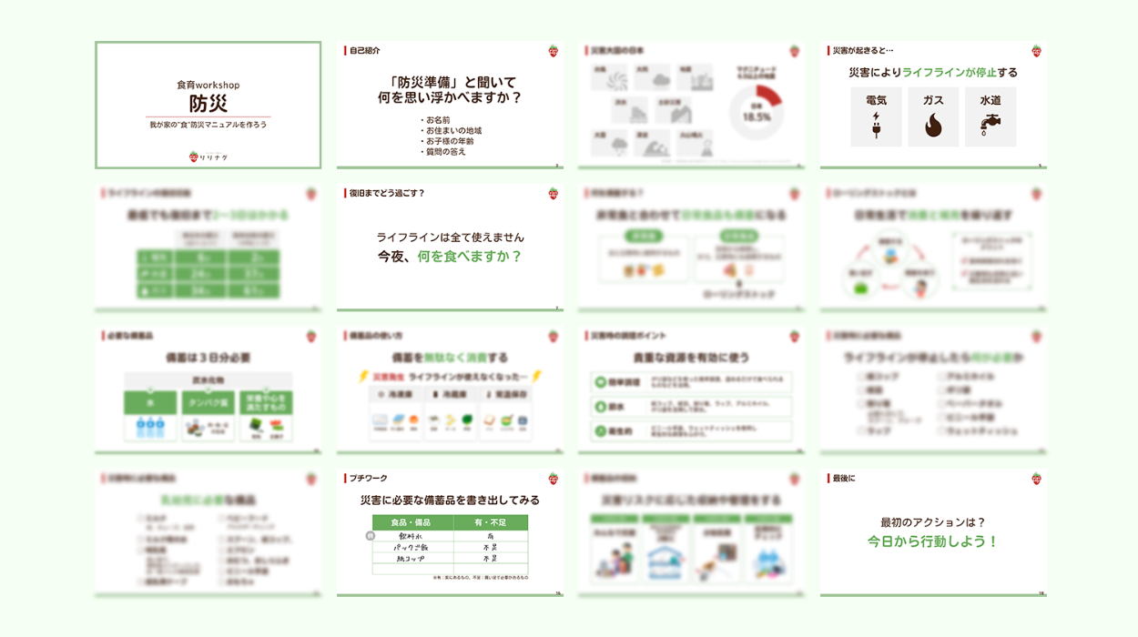 【制作実績】リリナグ株式会社様 みさこ 管理栄養士 × デザイナー OVERVIEW リリナグ株式会社様 食育セミナー資料 YEAR 2023 <制作物>食育セミナー資料原稿からCanvaにて制作<制作のポイント>パッと見やすい資料を心がけ、適宜イラストや写真を追加しました。リリナグ様のロゴから、緑と赤の配色を取り入れ、緑色をベースカラーとしています。<セミナー資料①>・スライド18枚、制作日数:7日<セミナー資料②>・スライド21枚、制作期間:7日