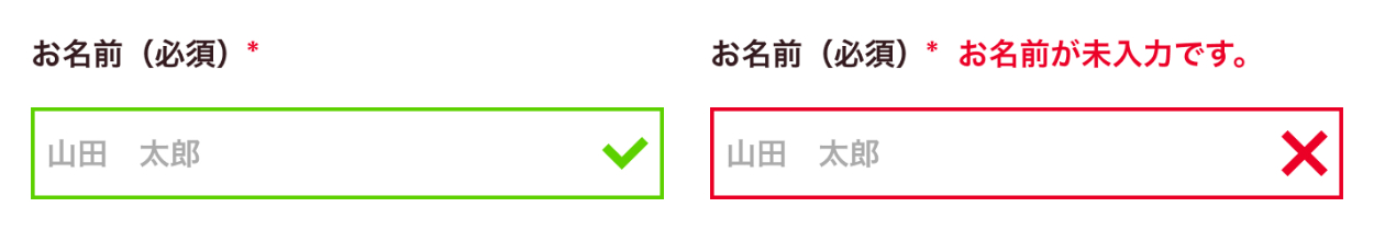 本来は下記画像のように、入力完了マークやエラーメッセージと入力エラーマークを表示するデザインを考えていましたが、今回Googleフォームを使用しての作成ということ、私自身がJavaScriptの知識がないことから、現在公開しているデザインに変更しています
