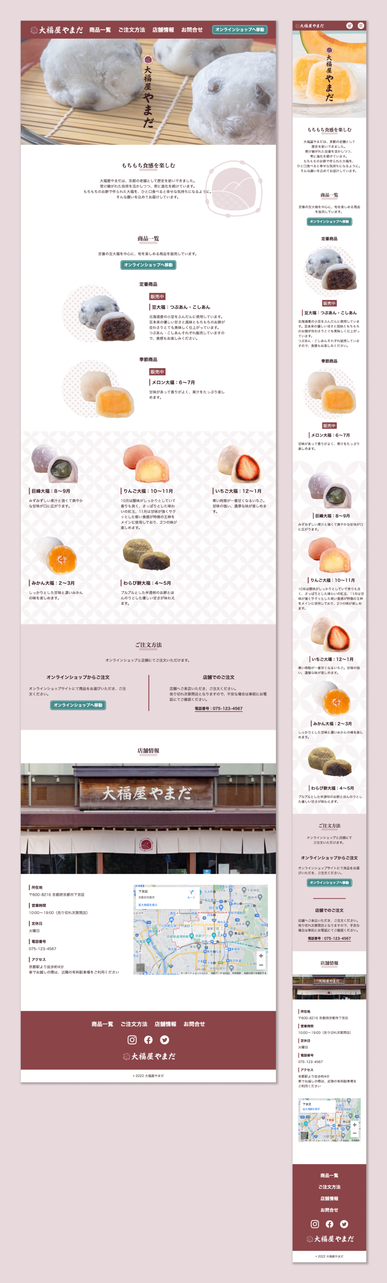 - ロゴのイラストはお店がメインで販売している豆大福をイメージし、店名の「やまだ」を表すようなデザインと和菓子という和風の雰囲気を出せるように意識