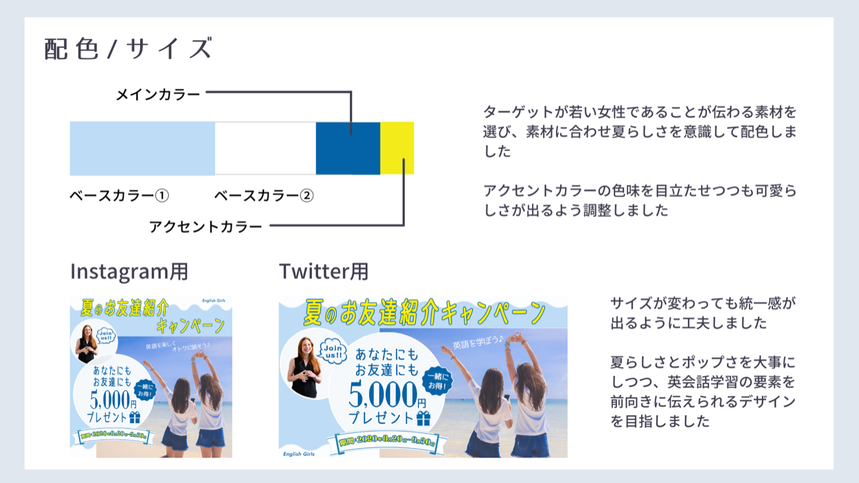 クライアント(20代女性向けのライトな英会話スクール)からの案件依頼という想定で0から依頼に沿ったバナーを制作する