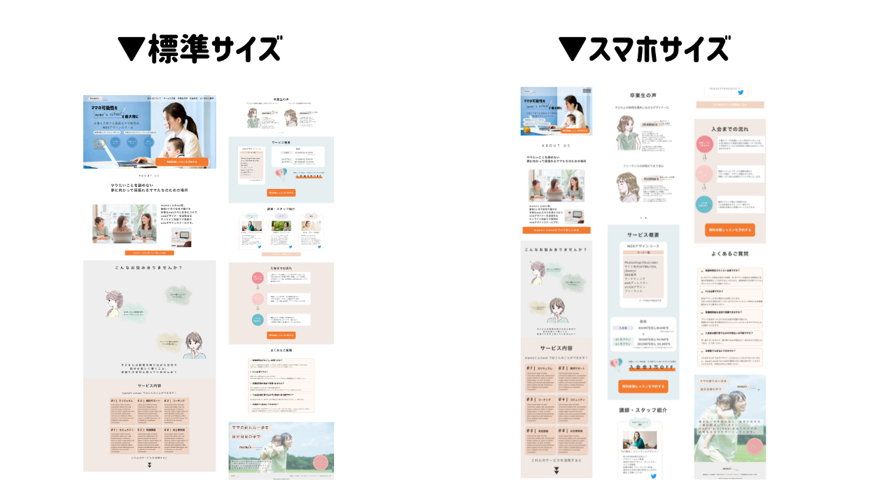 ・ママが安心して頑張れそうなスクールである印象を持ってもらえるよう、柔らかい印象の色合いやフォントを統一させた