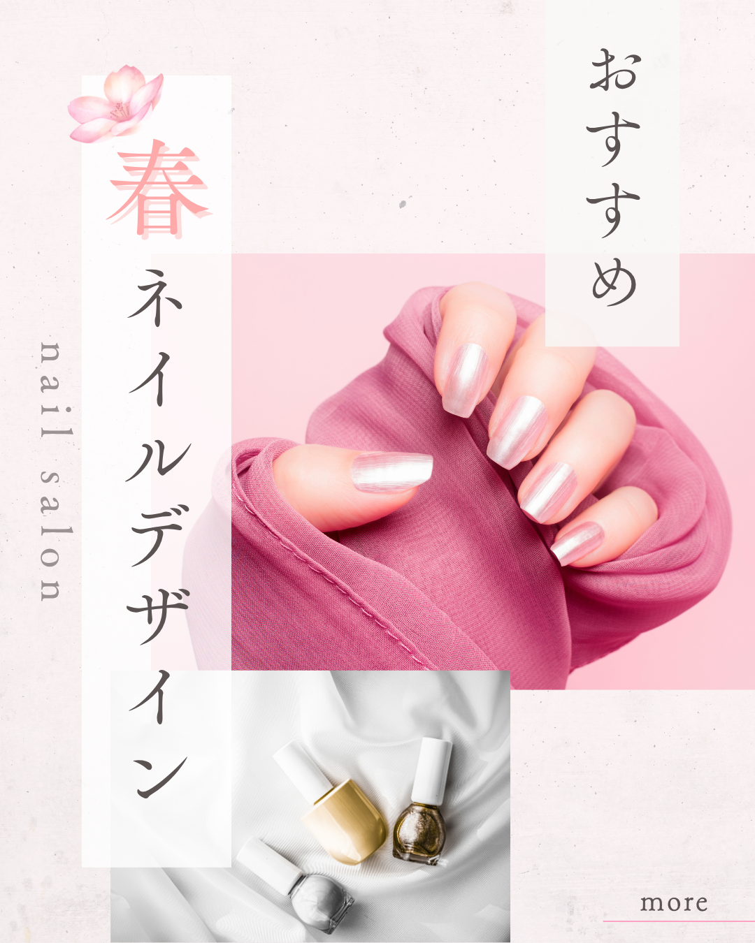20代女性向けのネイルサロンのInstagramアカウント想定し、おすすめデザインを紹介する投稿を作成しました。『春におすすめのネイルデザイン』をテーマに、デザインを行いました。 ※自主制作※