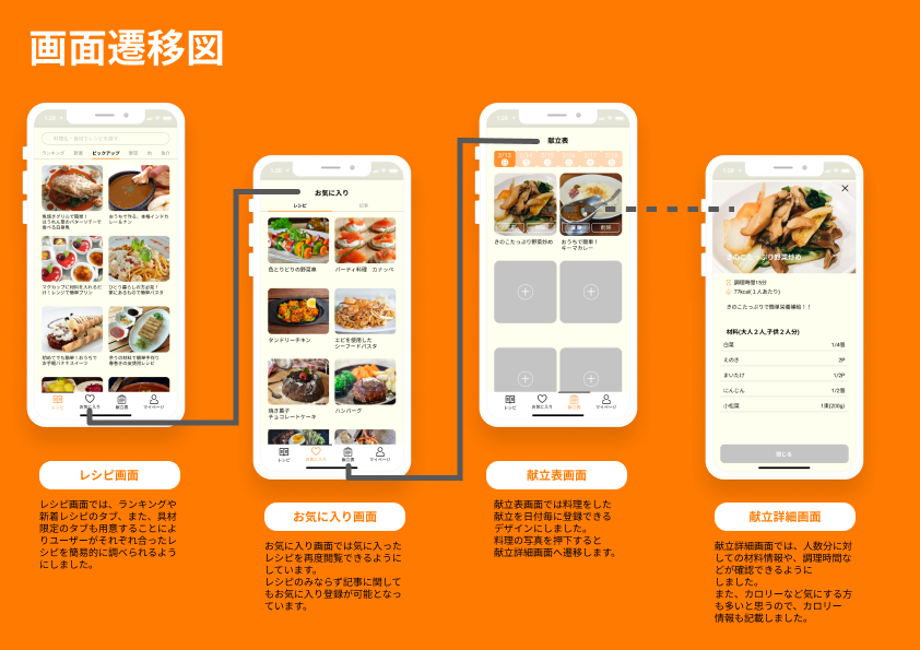 FoosFoo riku OVERVIEW 【UIデザイン】レシピ検索アプリ YEAR 2022 【ペルソナ】・夫と2人暮らし・料理が趣味・都内住み・料理の腕を上げたい主婦【画面遷移】【考え】料理画像一つ一つや、ボタンなどはやわらかいイメージとなるよう、角丸を採用しております。