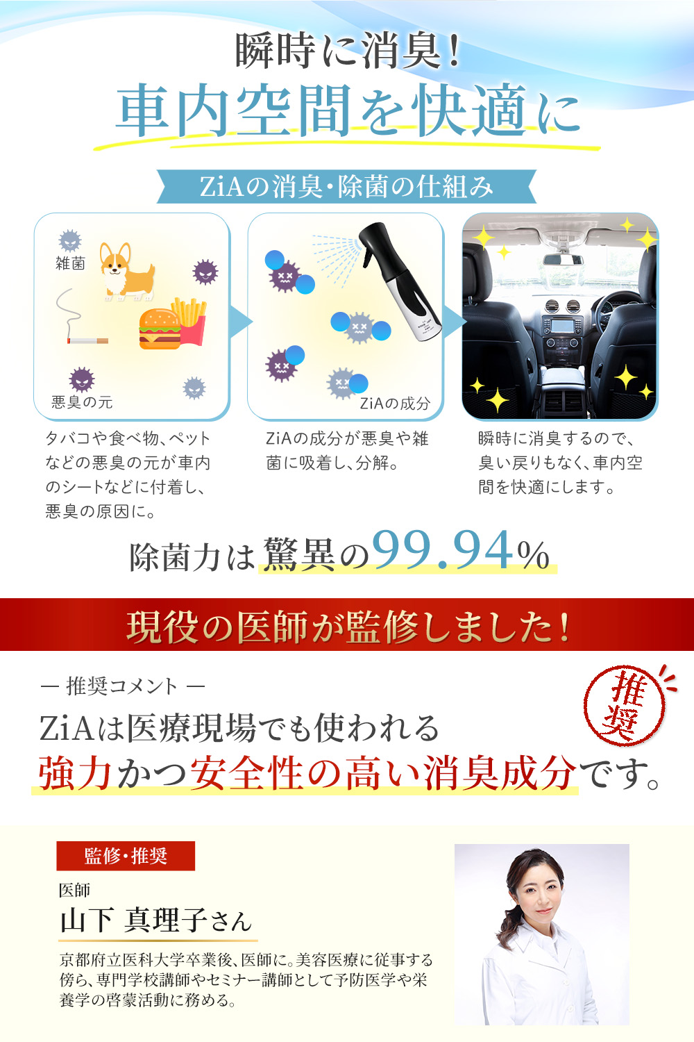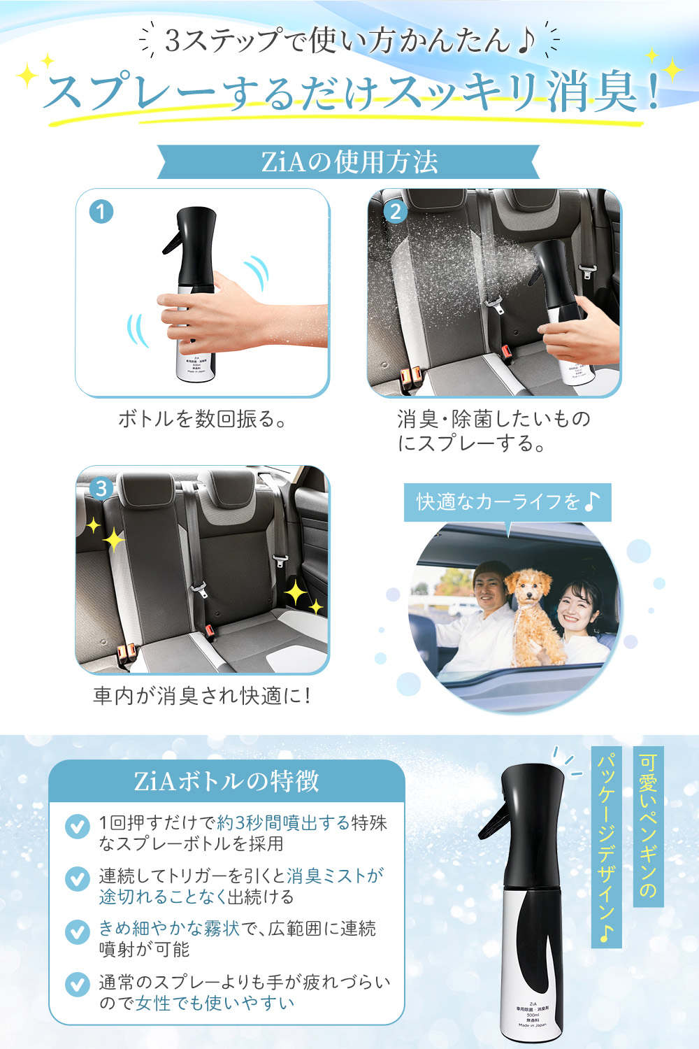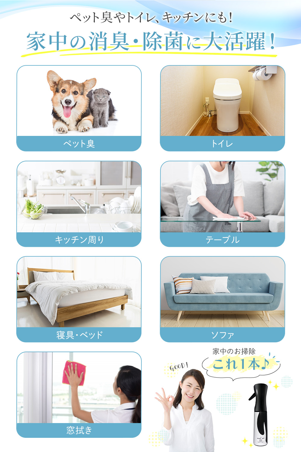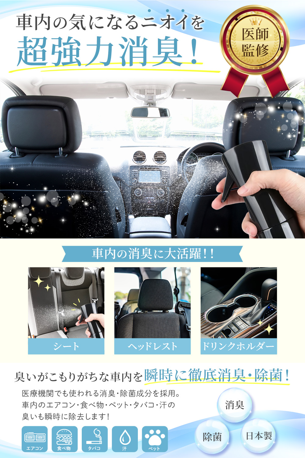 消臭スプレーの商品画像 yoko フリーランスWebデザイナー ECサイト(Amazon)で使用される消臭スプレーの商品画像を制作ターゲット:30代〜40代 女性 男性使用ツール:Photoshop・Illustrator