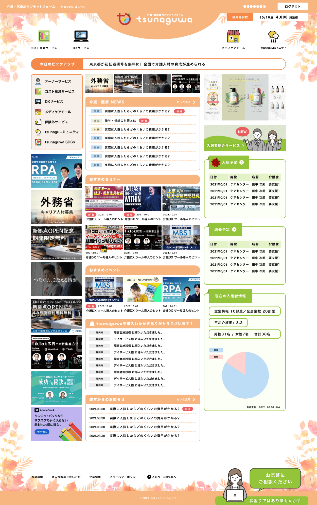 介護施設・ヘルパーの方にとって業務上優先度の高い情報をファーストビューで確認できるようにレイアウトした。広告を含め多くの情報が掲載される中でも、必要な機能と、新着情報、最新の入居予定情報がスクロールせずとも確認でき、タグによる分類で認知負荷を軽減した。