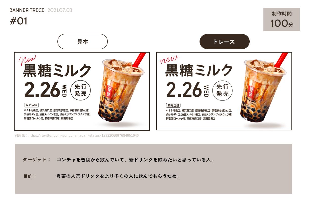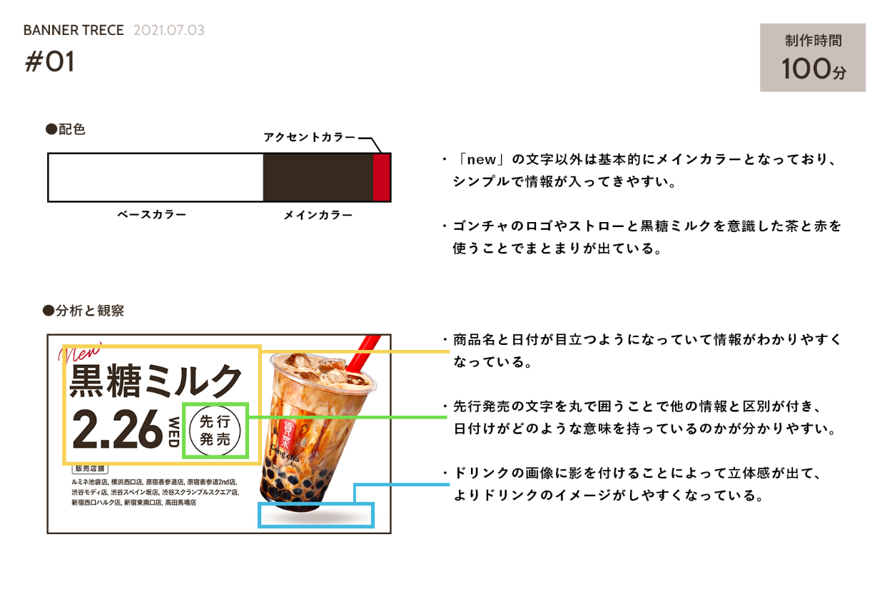 SHElikes MULTI CREATOR PROJECTの課題で、貢茶のバナートレースに取組みました。バナーの目的・ターゲット・配色・観察と分析の結果をまとめました。(制作時間:トレース100分 / まとめ100分)