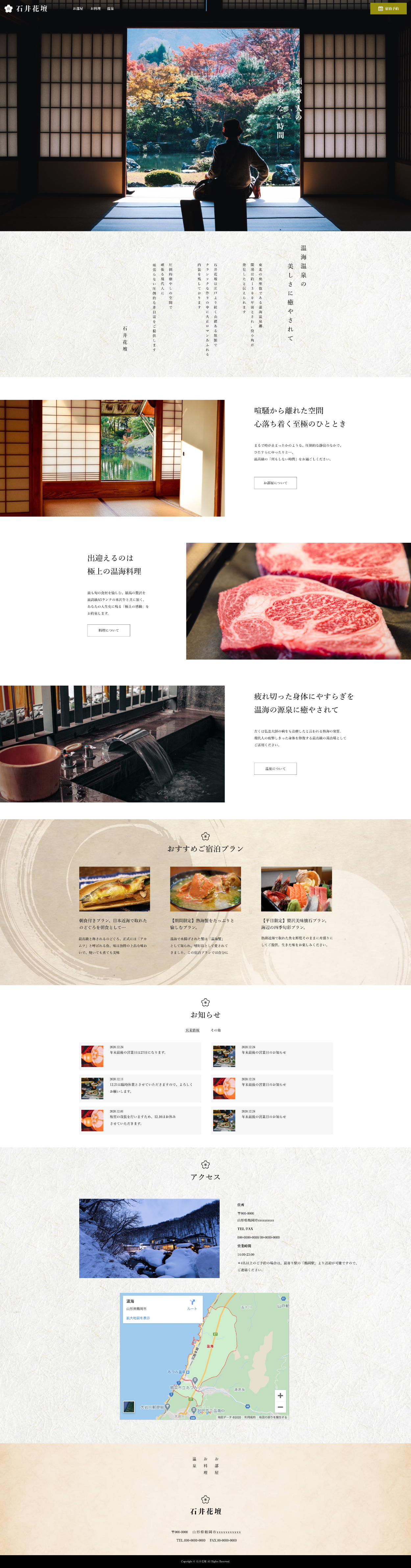 html,CSS(Sass),JavaScript(jQuery)を利用してXDファイルから架空の旅館サイトをコーディングしました。2021年9月に作成、制作時間は約50時間。全4ページ、レスポンシブ対応済み。