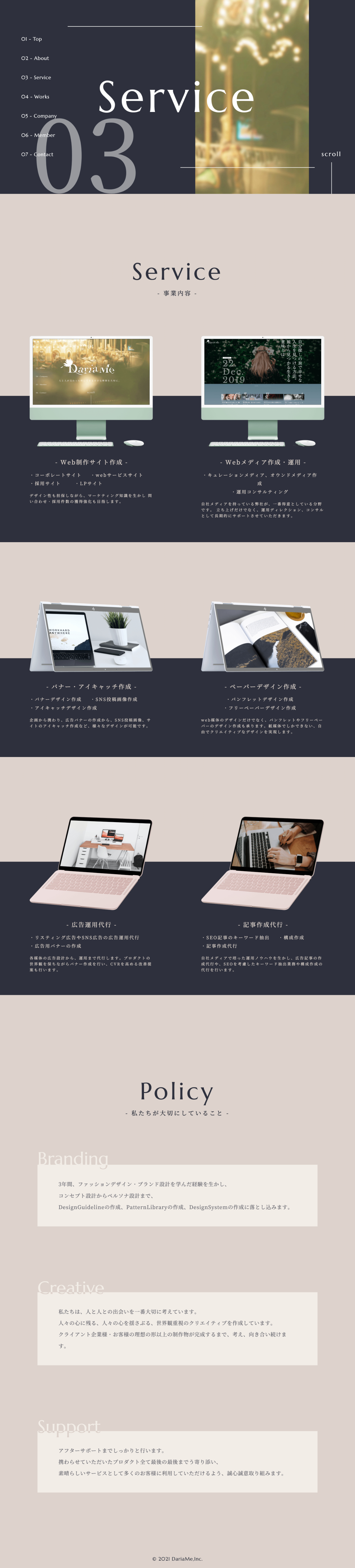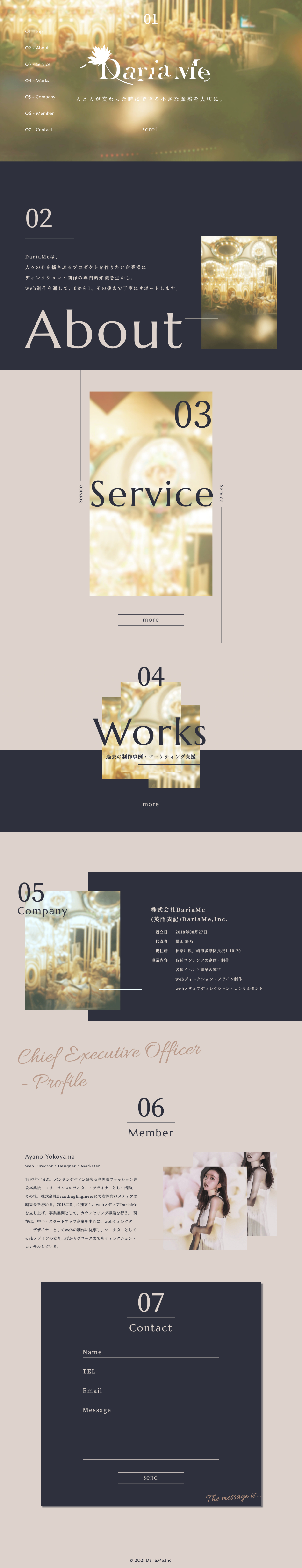 株式会社DariaMe様のサイトコーディングを担当しました。(サイトリニューアル予定) HTML,CSS,Javascriptを使用した静的サイトです。 問い合わせページではPHPを使用しています。 構築ではGulpを使用しFLOCSS設計でコーディングを行いました。