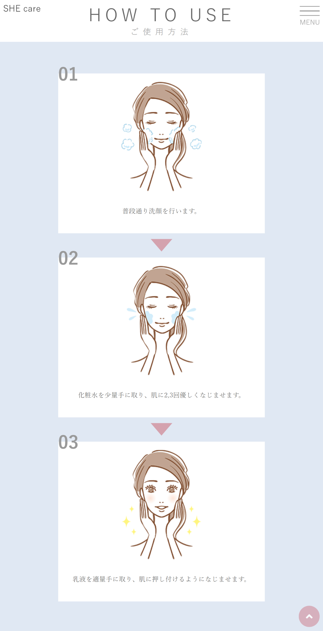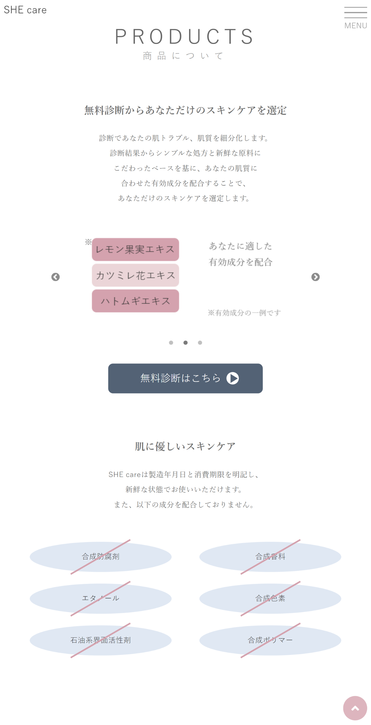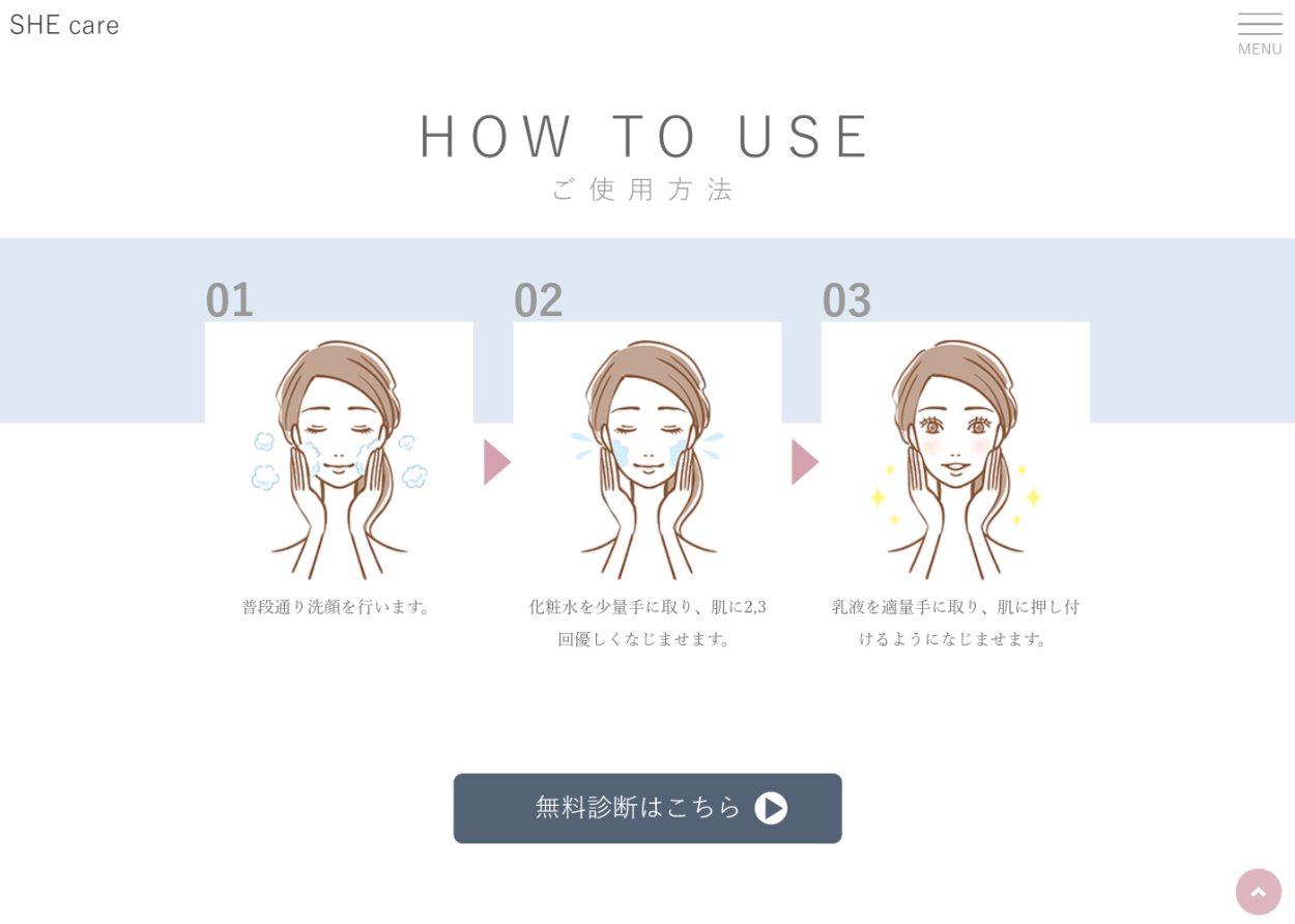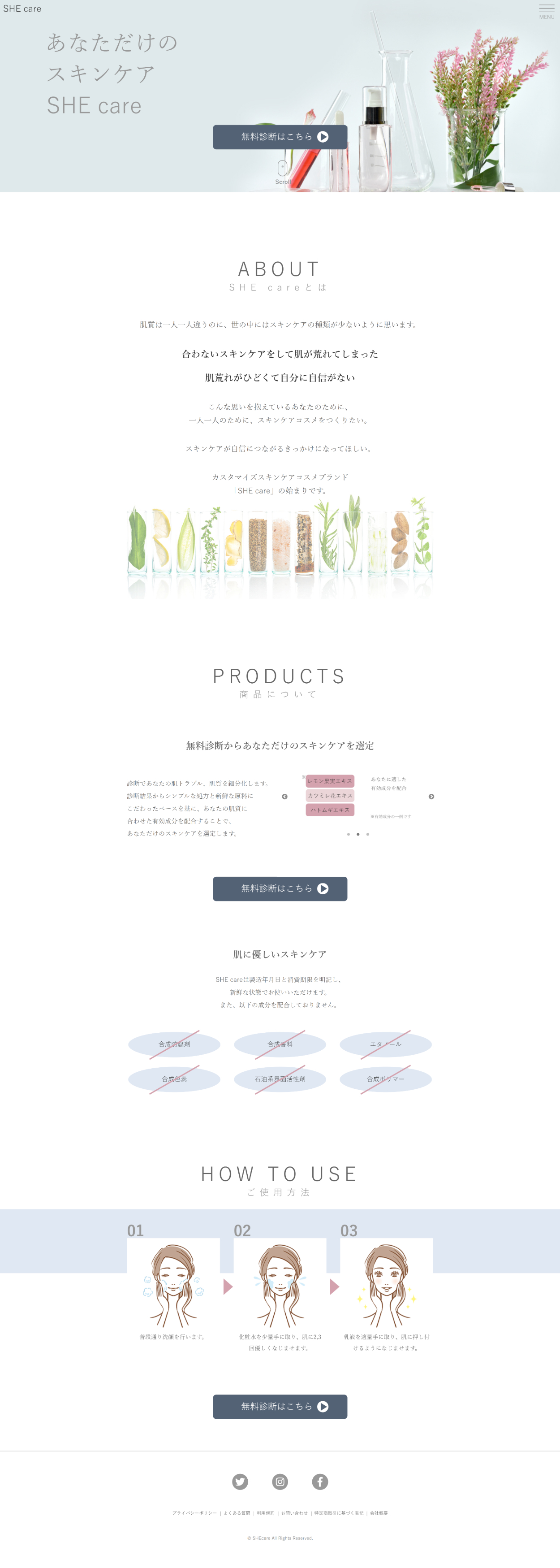 架空のカスタマイズスキンケアコスメのHP (ABOUT、PRODUCTS、HOW TO USE)