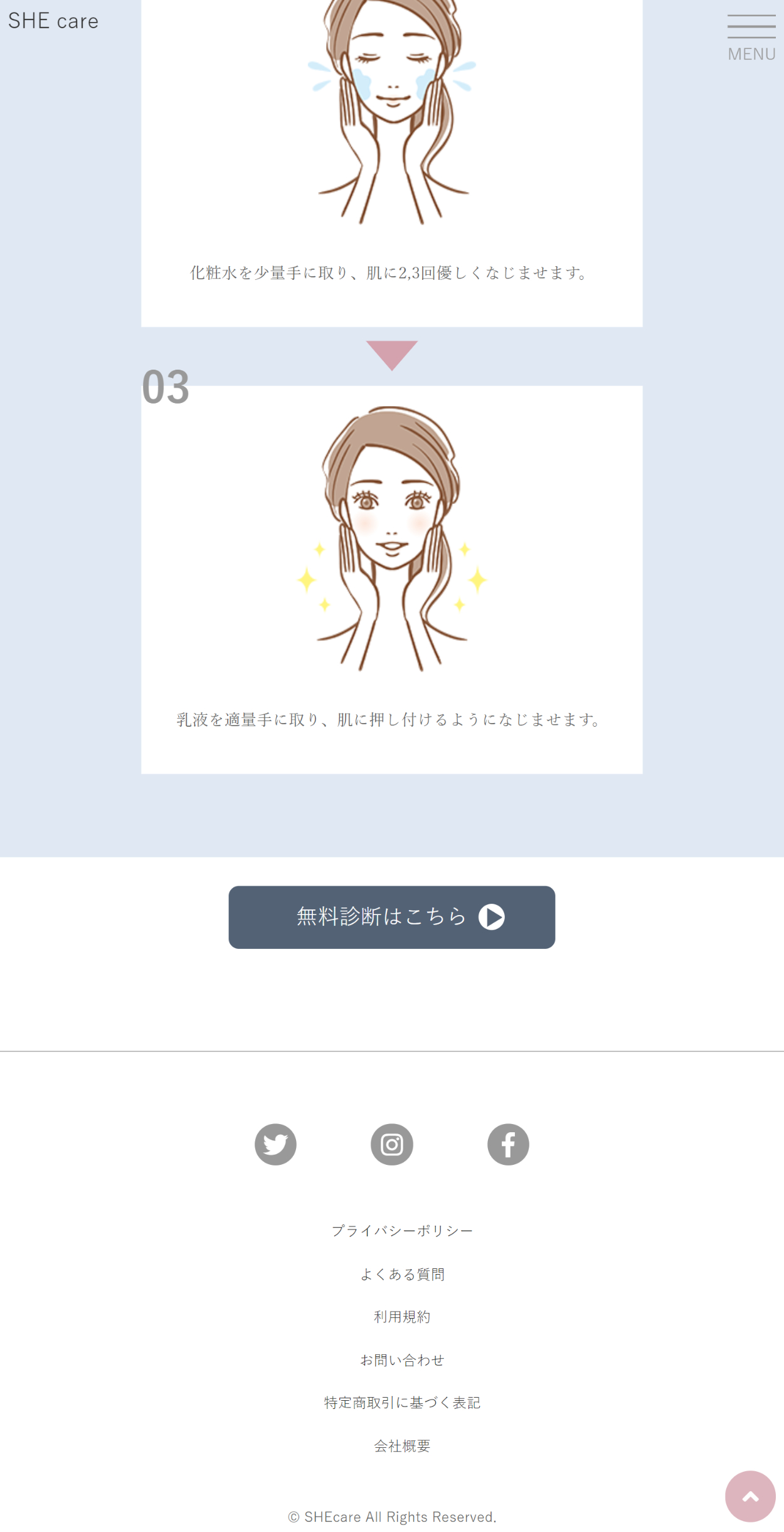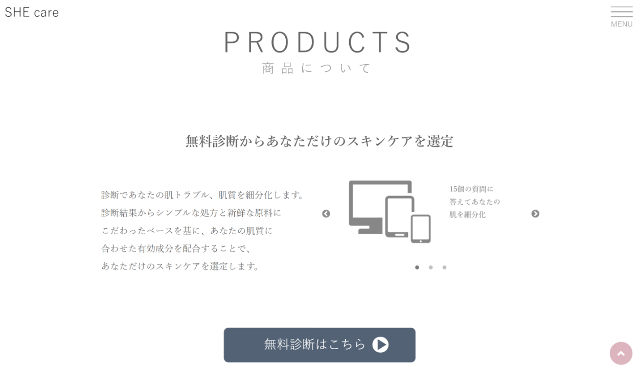 ・「無料診断はこちら」ボタンやPRODUCTS内の図形に円形、楕円形が使用されているのでSNSのロゴも円形を適用