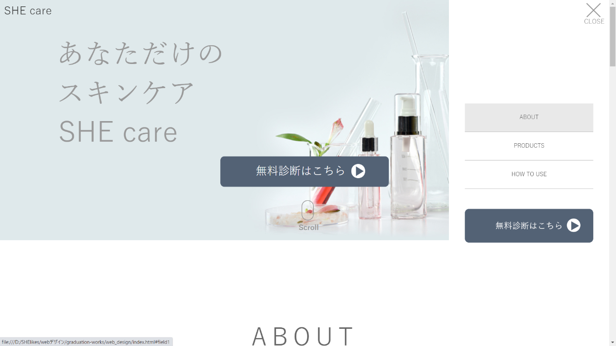 自分自身が肌荒れに悩んでおり、カスタマイズスキンケアコスメがあったらいいなと思い、架空のスキンケアコスメのHPを制作。