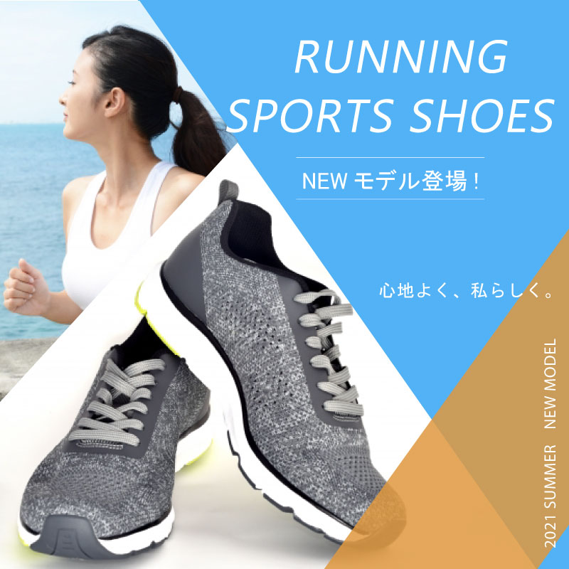架空の30代女性向けランニングシューズのバナーです。心地よさと爽やかさを演出したデザインを心掛けました。 ECサイトの画像スライダーに掲載するイメージで制作しました。