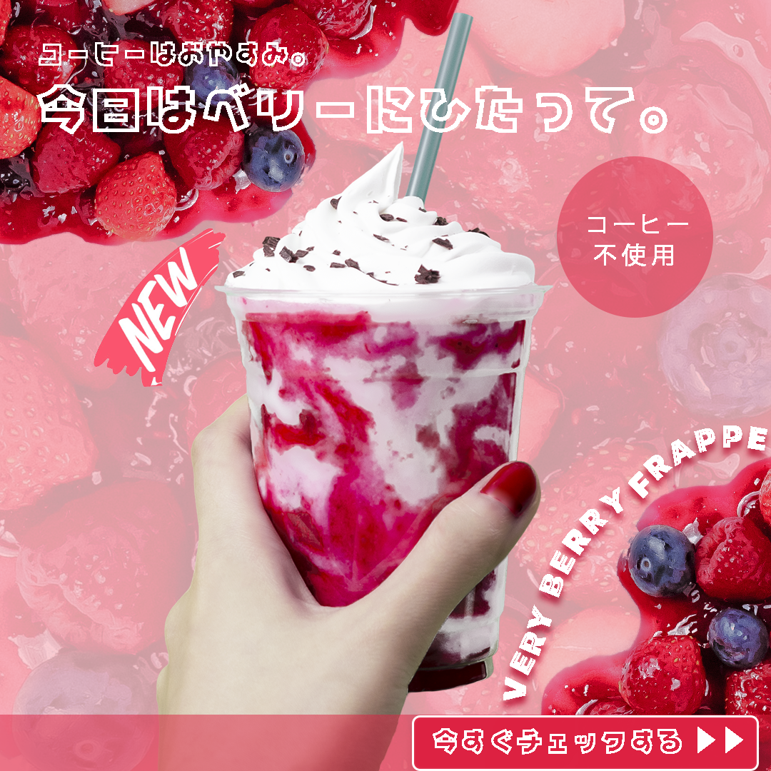 【架空案件】コーヒー不使用ベリーフラッペのバナー Nana Webデザイナー コーヒー不使用の新商品VERY×BERRY×FRAPPEのバナーを制作しました。3種のベリーをふんだんに使用していることがわかるデザインにしました。◇Photoshop