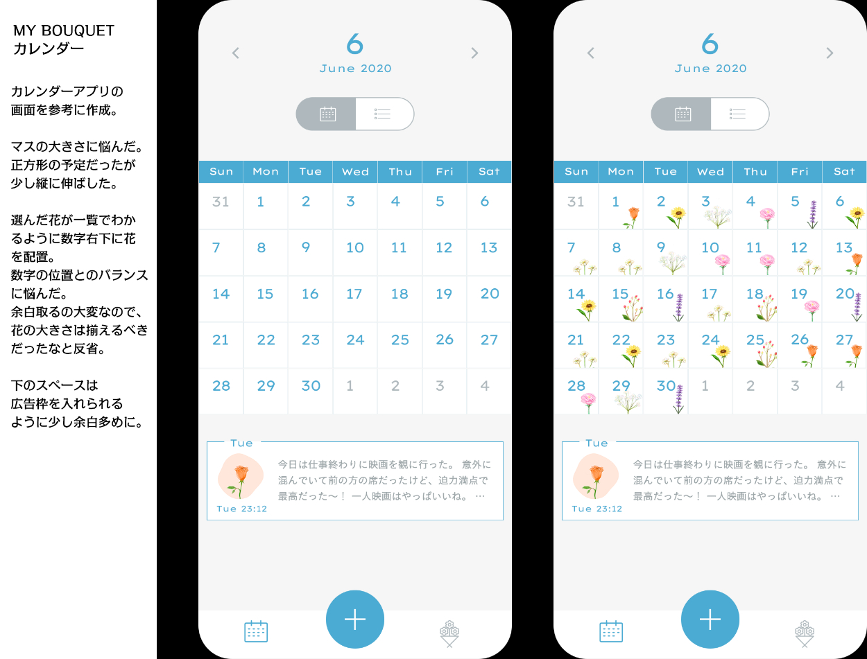 自社開発予定であったアプリ「MY BOUQUET」の画面用にイラスト作成+カレンダー画面を作成。