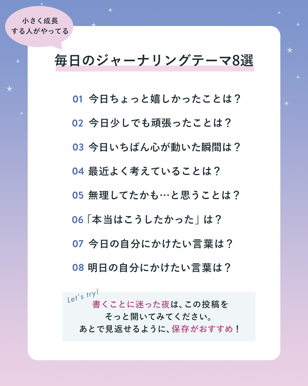 ・紹介した8つのジャーナリングテーマを箇条書きで再掲