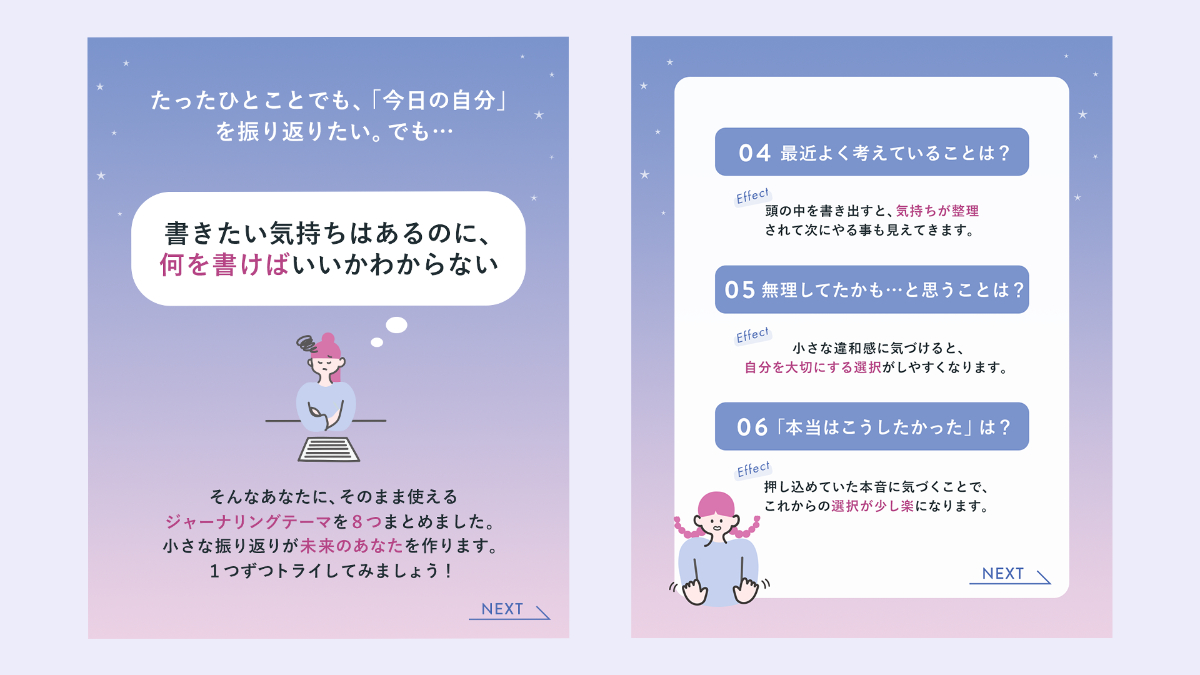 ・次ページ以降で「そのまま使えるジャーナリングテーマ」が得られると分かるデザインをお願いします