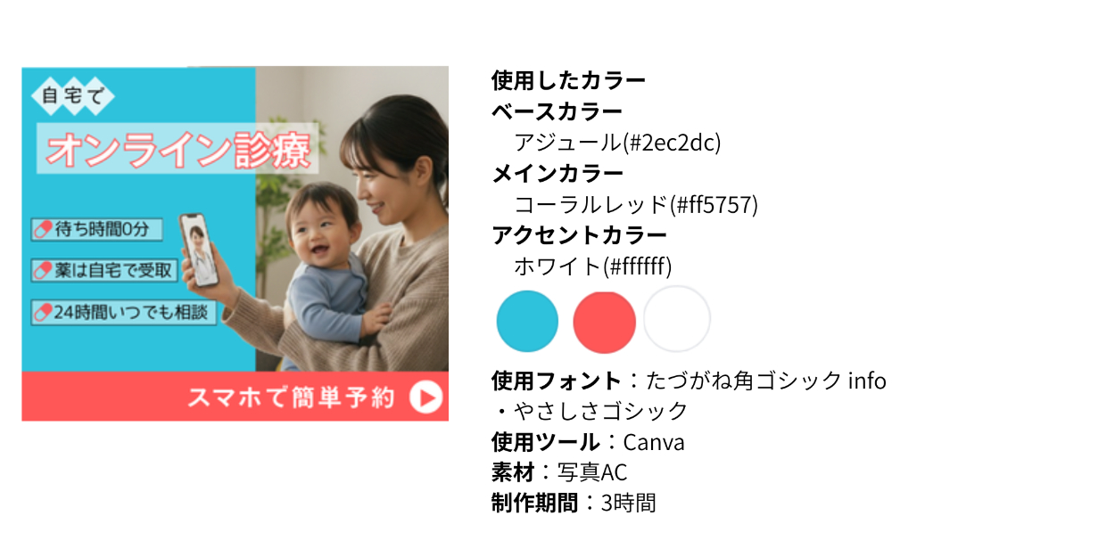 子育て世代や忙しい社会人をターゲットに、自宅で受診できるオンライン診療サービスの集客用バナーを制作しました。 「安心感」と「手軽さ」が一目で伝わることを目的としています。