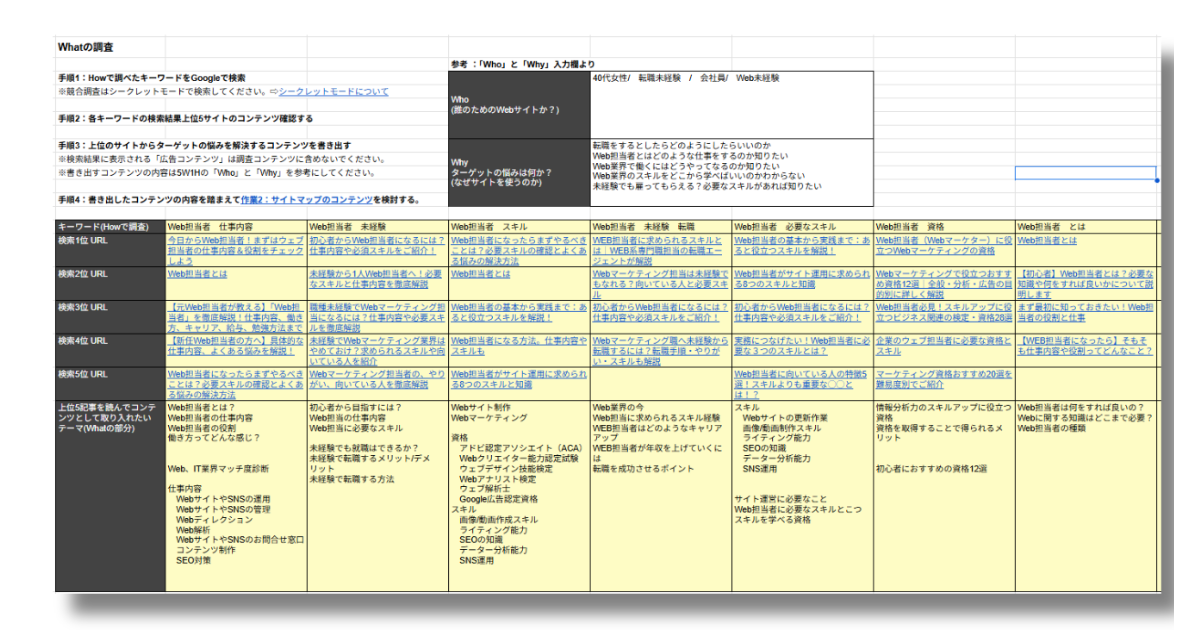 ターゲットのニーズ・悩みを5W1Hを意識して調査。