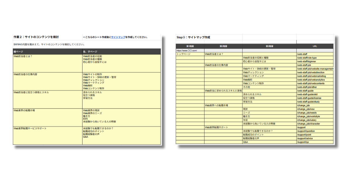 5W1Hの内容をふまえて、必要なサイトのコンテンツを検討。