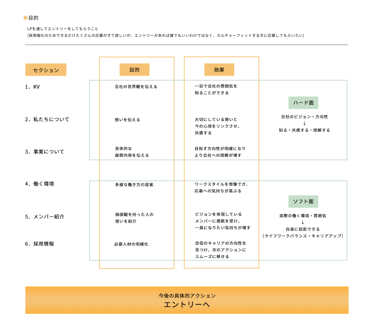 ・まずは企業の世界観を表現し(ハード面)、「ここで働きたい!!」という気持ちを高め、次に現実的にどんな環境で条件でワークライフバランスが取れるのか(ソフト面)を表現することで、エントリーまでの動機づけをスムーズに行える情報設計にしました