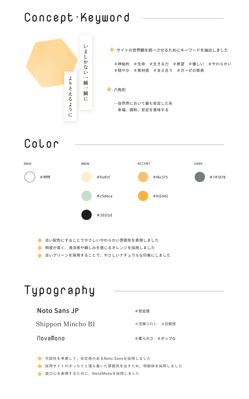 ・六角形の意味合いが【幸福・調和・安定】というところから、企業の未来に向けた展望と、事業の安定さとリンクさせて各セクションに配置しました。