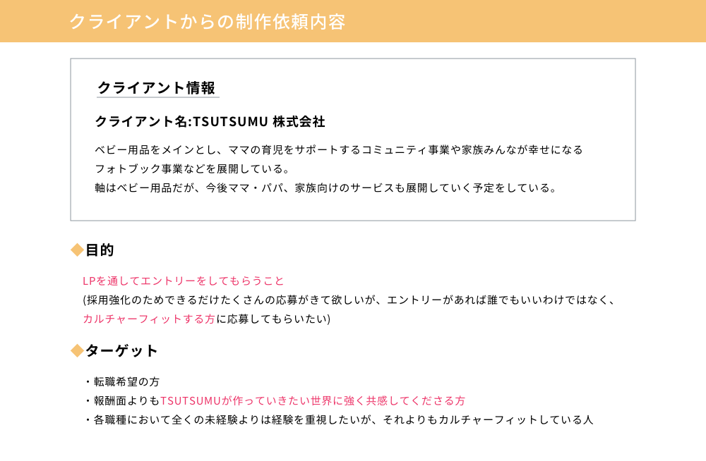 ・クライアントからの要望に報酬面よりもカルチャーフィットする人材、また今後の事業展開としてモノの販売から、ファミリーに向けたサービスの展開をして事業拡大していく方針があることから、よりその環境に近しい人材にフォーカスして設定しました