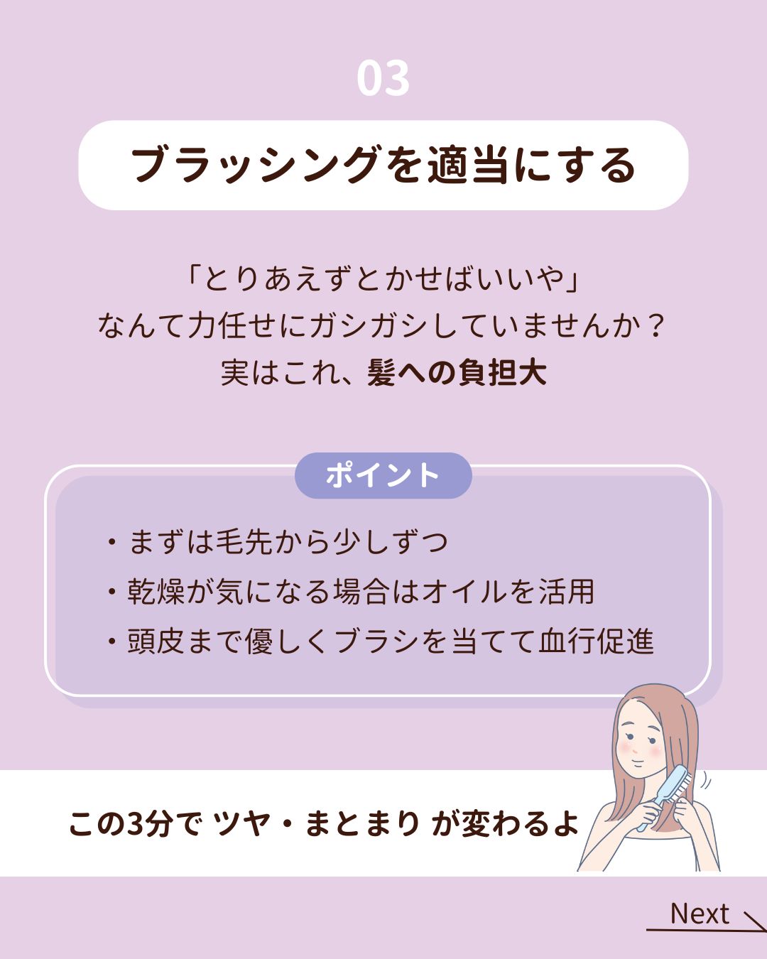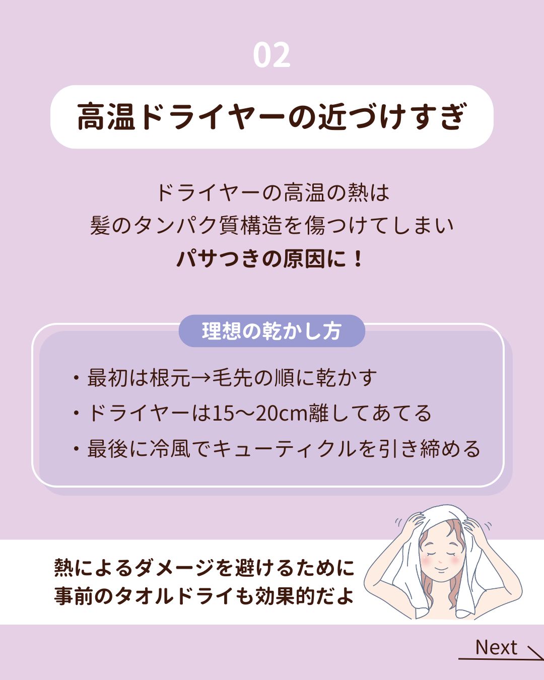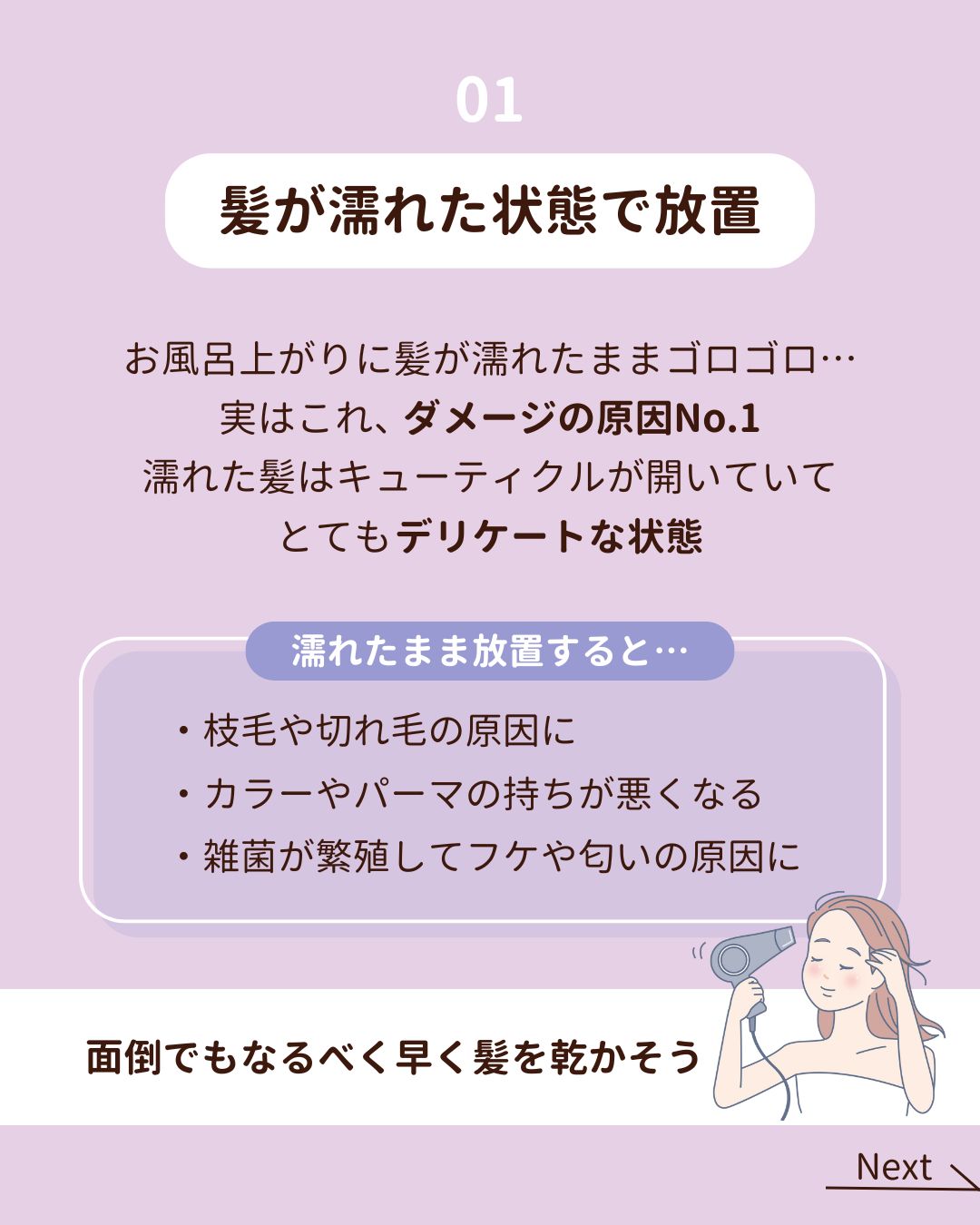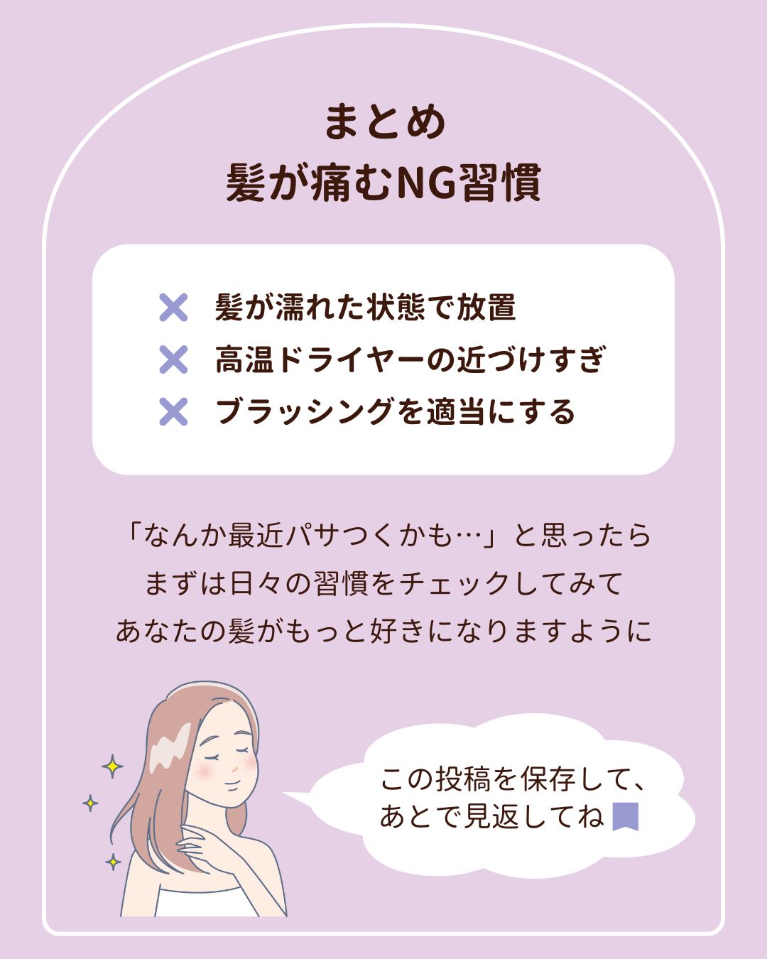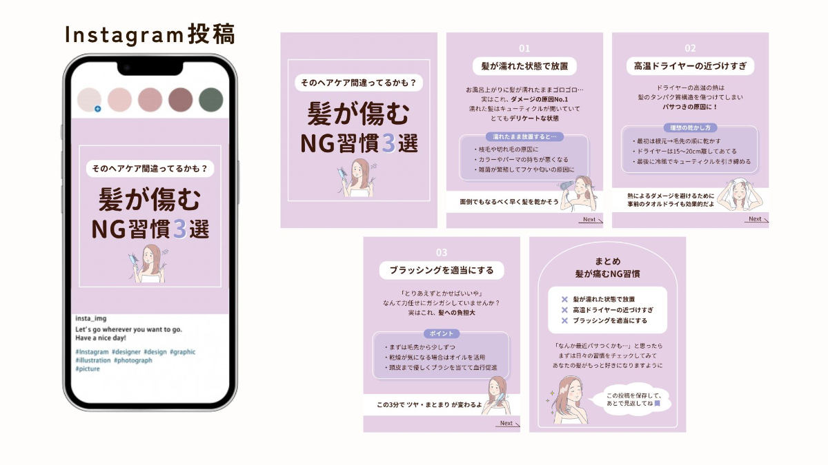 ・「髪が痛むNG習慣」を題材に、ヘアケアに悩みや興味のある女性が読んで保存したくなるような投稿