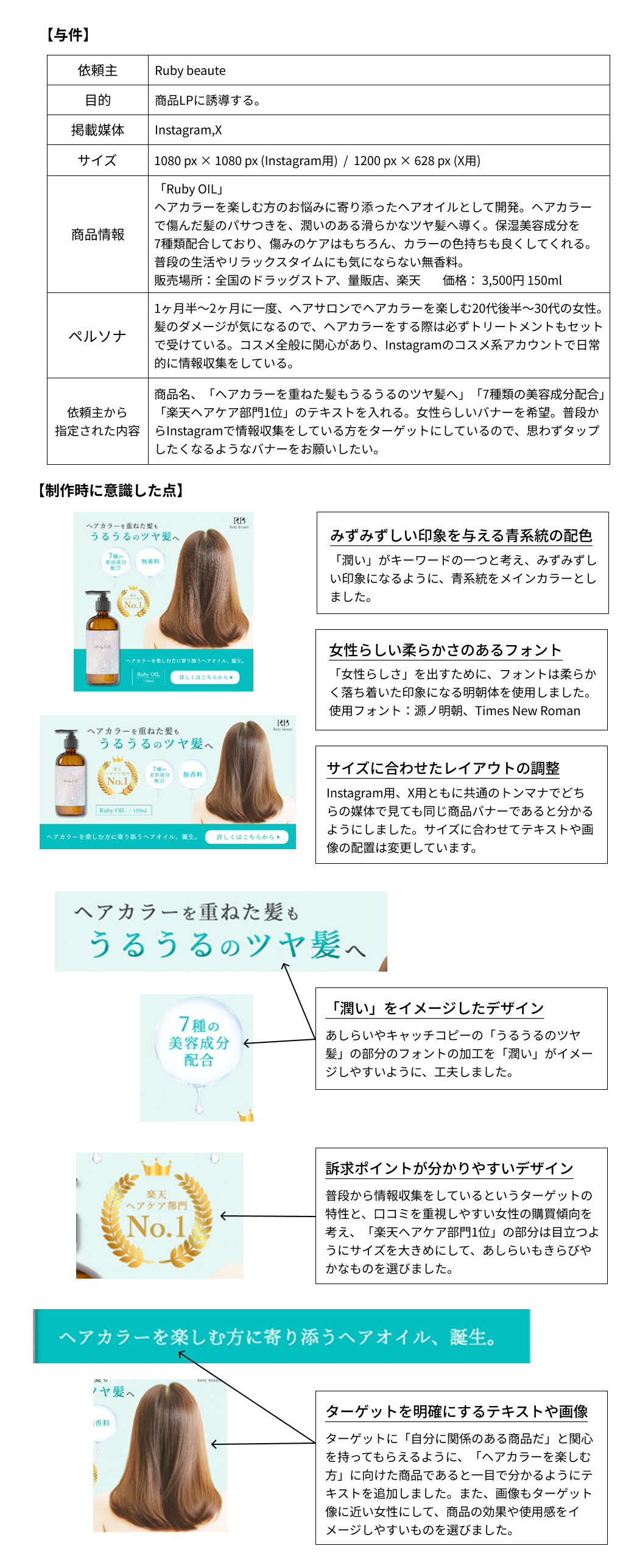 【課題】ヘアオイルバナー Onishi|おおにし Webデザイナー OVERVIEW WebデザインスクールHerTechの課題として、ヘアオイルバナーをPhotoshopで制作しました。 YEAR 2025 ▲Instagram用(1080px × 1080px)▲X用(1200px × 628px)