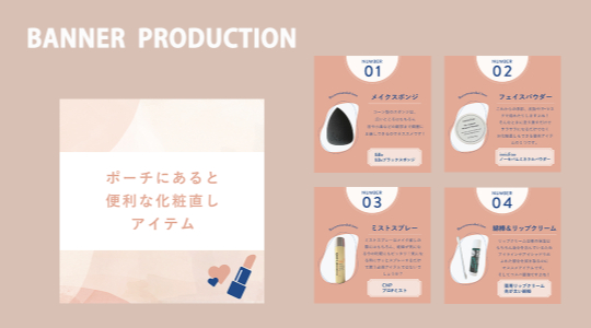 - テーマが化粧直しということで少なくとも美容に興味がある方がターゲットになると考えました。そのため画像後ろの背景などを今どきっぽいあしらいにし、手を止めて見ていただけるようにしました。