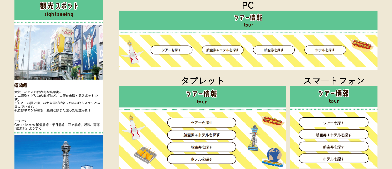- ファーストビューで、サイトの内容や大阪ならではの賑やかな雰囲気・魅力が伝わるデザインを意識しました。