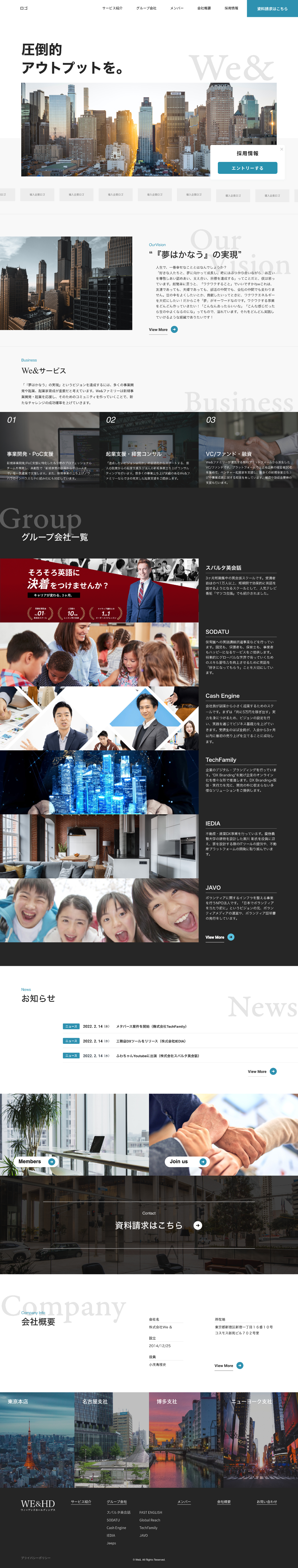 We&グループ様 企業コーポレートサイト 佐々木 雄大 Webデザイナー OVERVIEW グループ会社として信頼感、誠実さが伝わるサイトにして欲しいと依頼があり 要件定義からデザイン制作まで携わりました。 YEAR 2022 クライアント:We&グループ担当:要件定義、ディレクション、ワイヤー構成、デザイン制作期間:3ヶ月(ヒアリング〜納品) WEBSITE