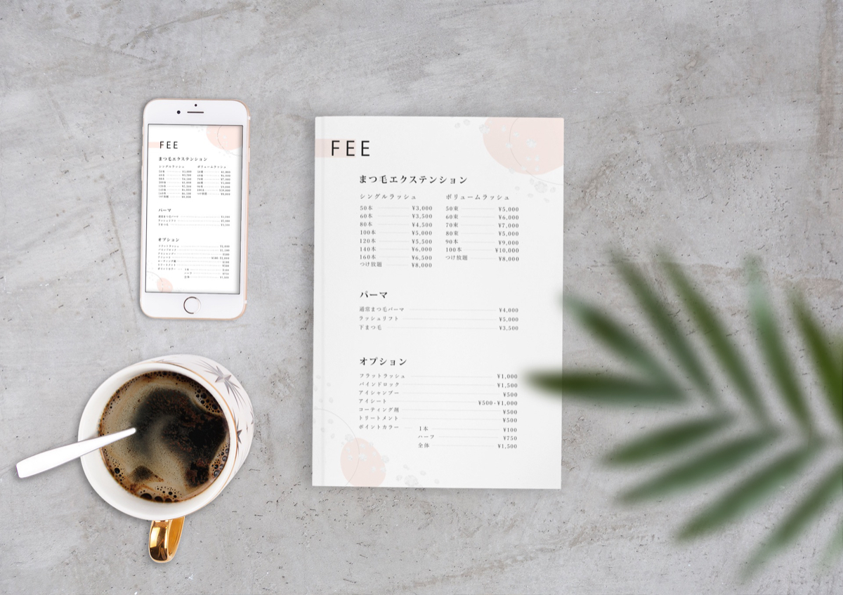 マツエクサロンメニュー表 ▶︎Instagram広告 ▶︎紙 (自主制作) 美里 WEBデザイン 高級ソファーを使用したラグジュアリーな店内をイメージして作りました。上品さを出すために文字を明朝体にして、とにかく綺麗に整列させました。