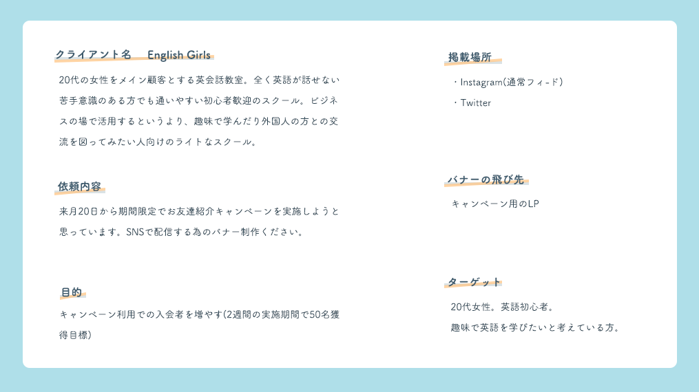 クライアントの要望に合わせるだけでなく、ユーザーにどのようにバナーを見てほしいか、目線の動きを情報を受け取る人の立場になって配色、文字の位置や大きさなどを設計する大切さを学んだ。