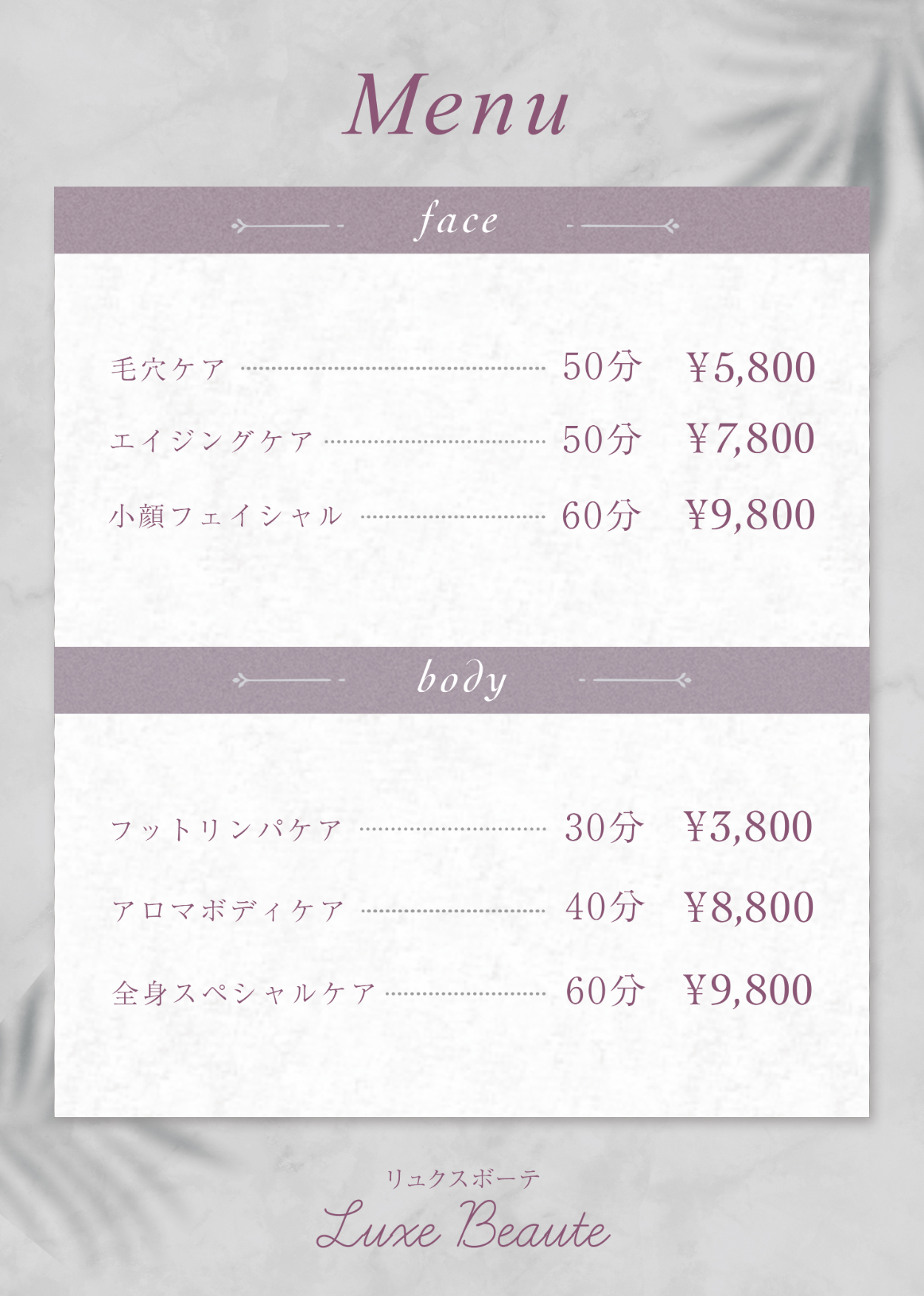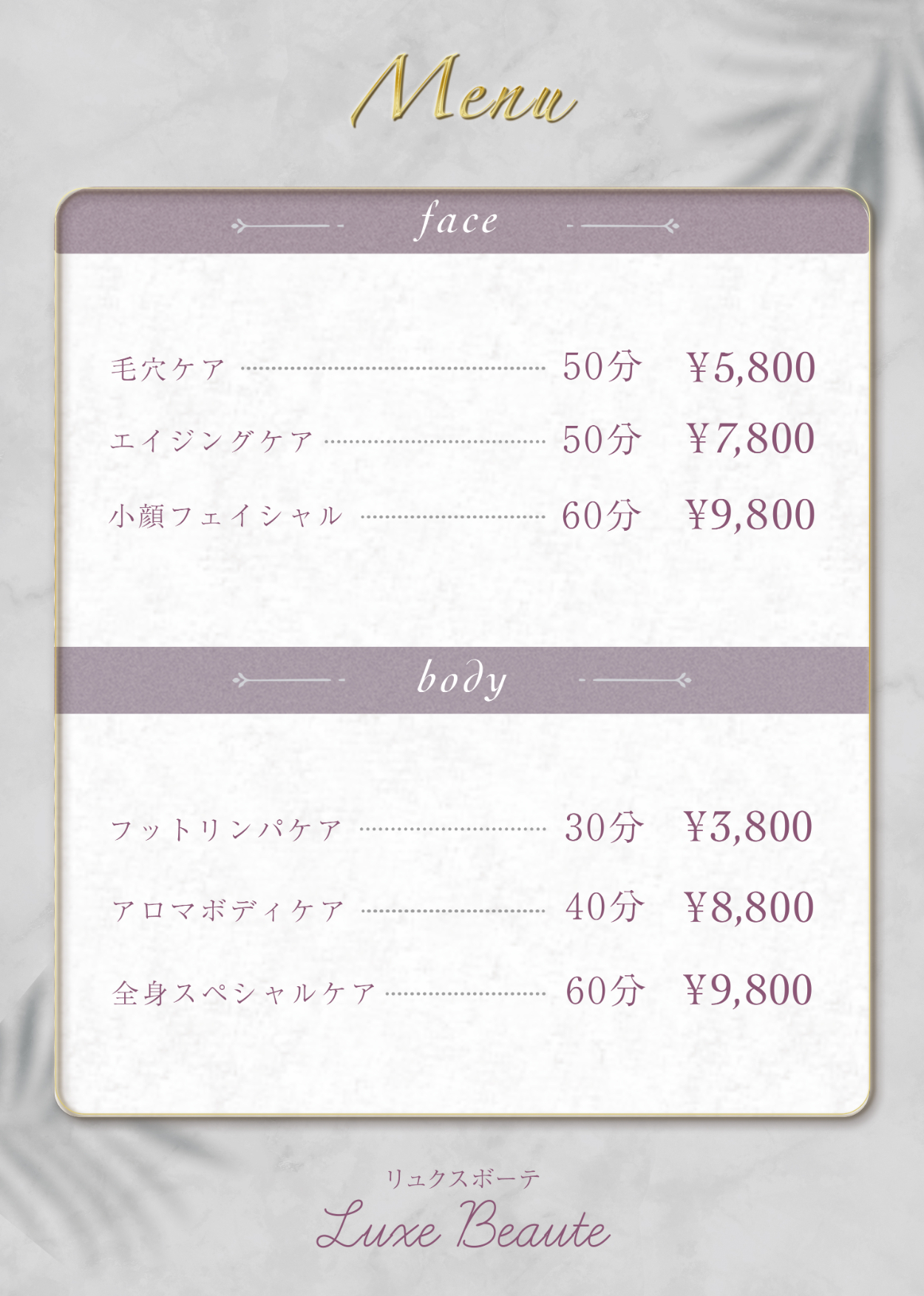 - 店内においてお客様へ施術コースを案内する際に使用するメニュー表なので、料金やメニューの2点の情報を配置しました。